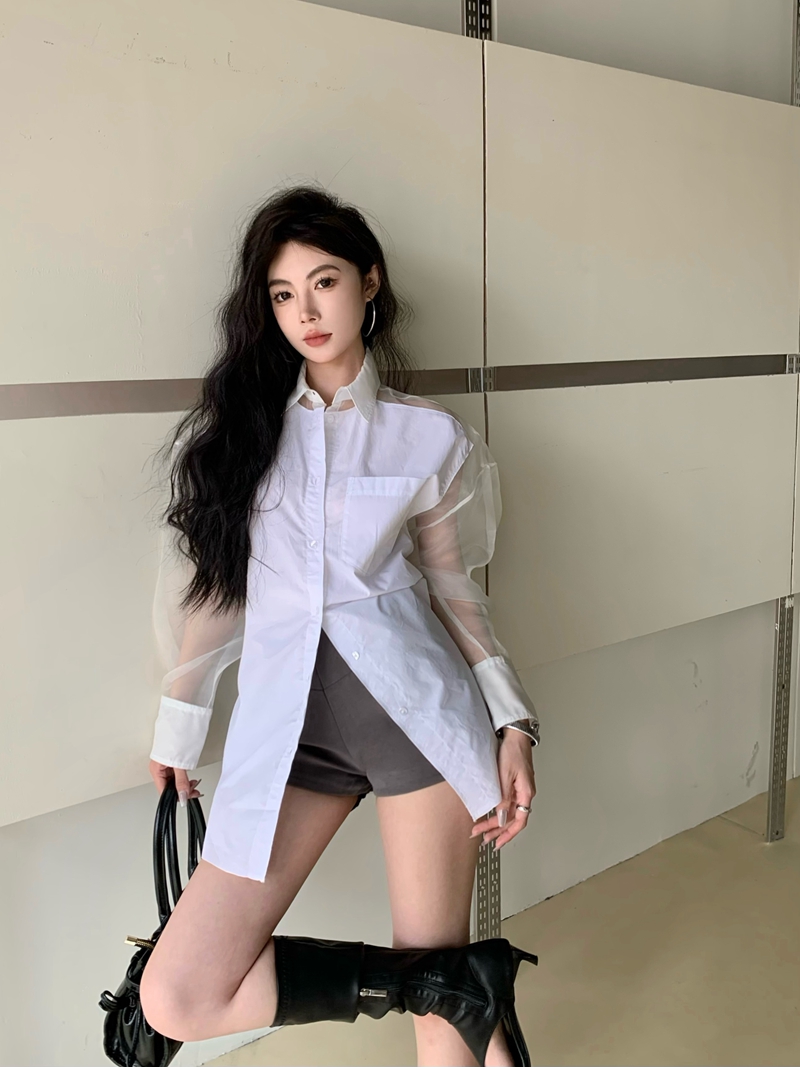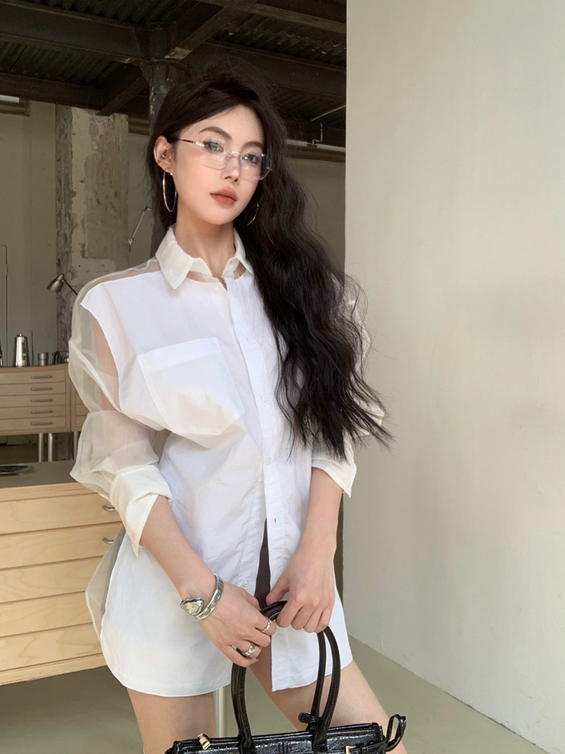 실제 가격 여름 섹시한 여자 스타일 메쉬 스 플라이 싱 관점 느슨한 긴팔 셔츠 풀 자매 탑