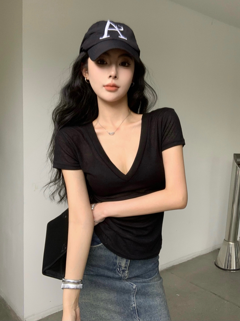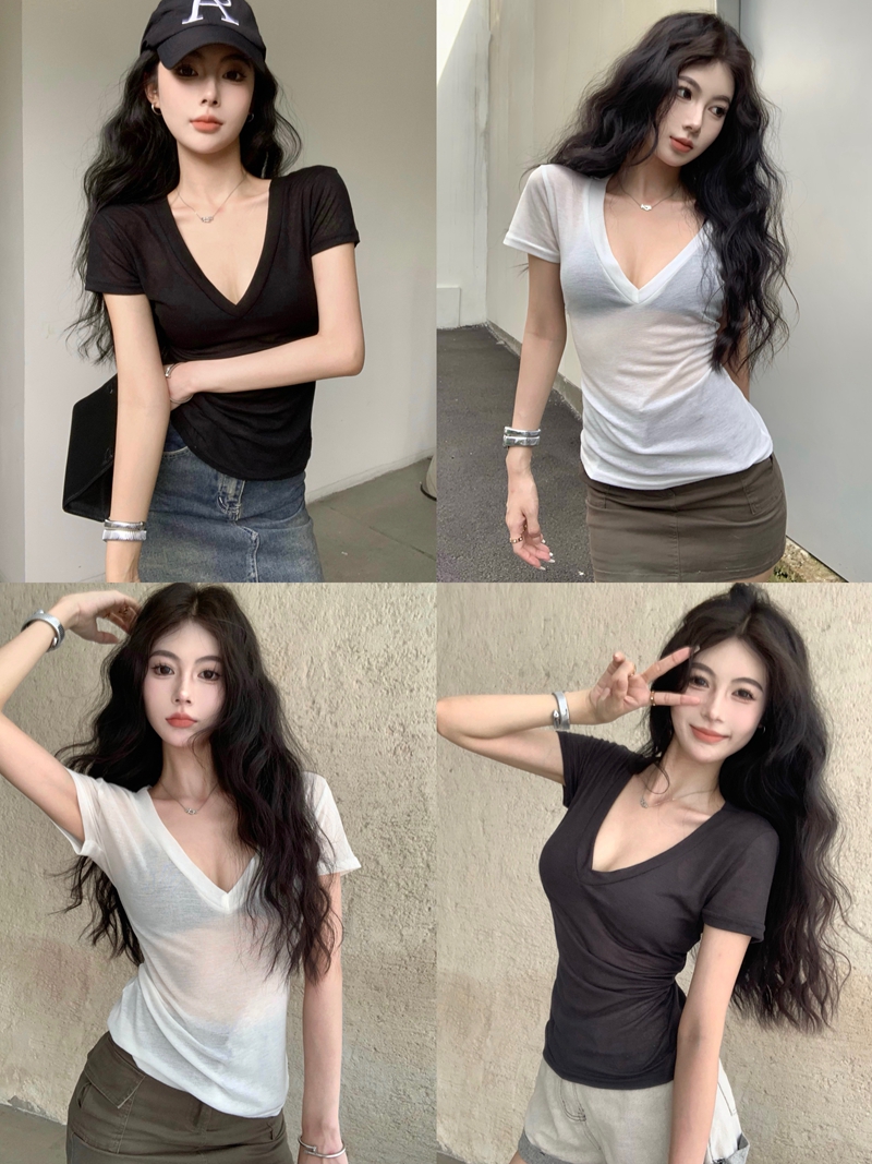 실제 가격 여름 핫 걸 스타일 고급 얇은 스타일 약간 투명한 섹시한 쿨 처진 마스크 ​​찰과 V- 넥 단락 티셔츠