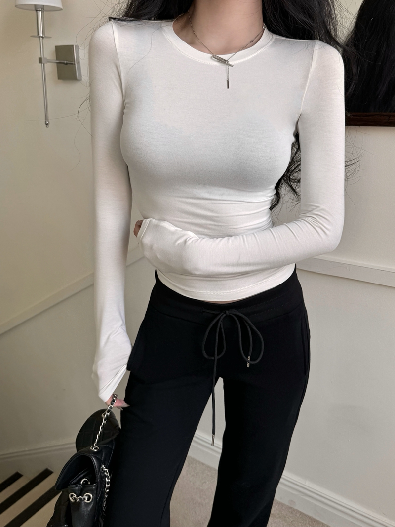실제 봄 라운드 목이 긴팔 티셔츠 얇은 모델 모달 기본 슬림 및 다목적 탑베이스 셔츠