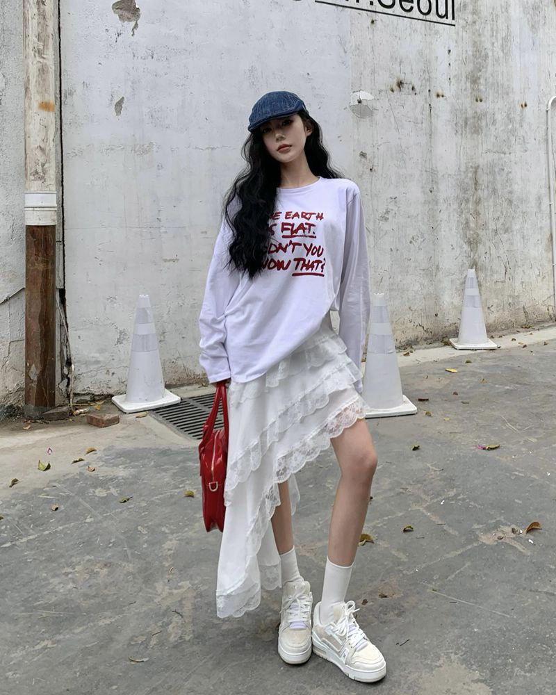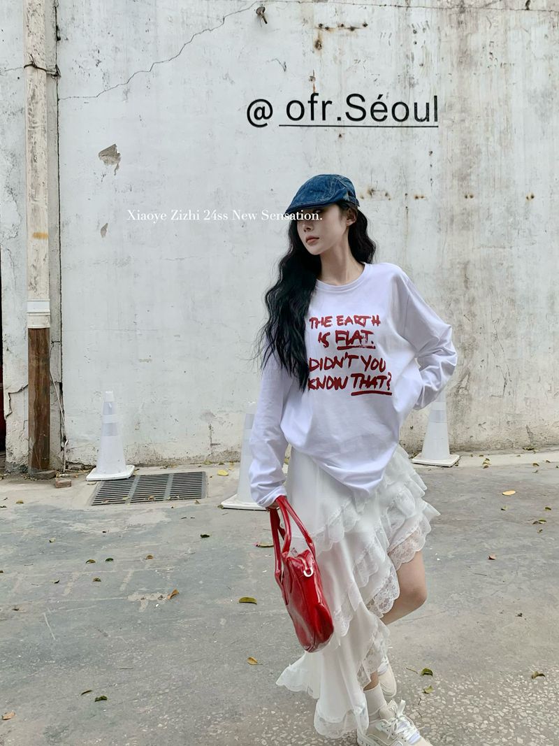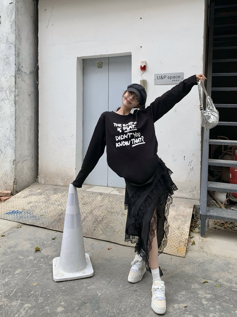 실제 수명 인쇄 느슨하고 넓은 버전의 긴팔 티셔츠 + 불규칙한 세련된 레이스 스 플라이 싱 스커트 슈트