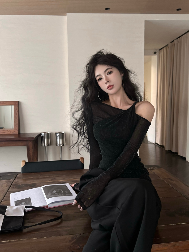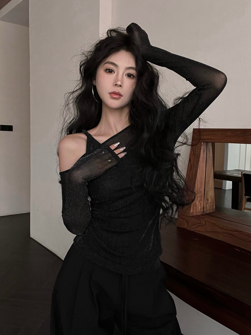 Real-Price Spring Hot Girl 스타일 슬림하고 슬림 반 트랜스 슬루코 인 서스펜더 오프 숄더 긴 슬리브 반짝이는 티셔츠 탑