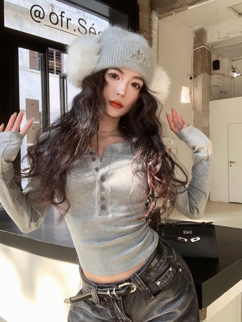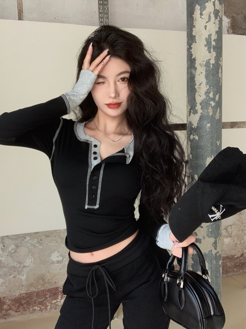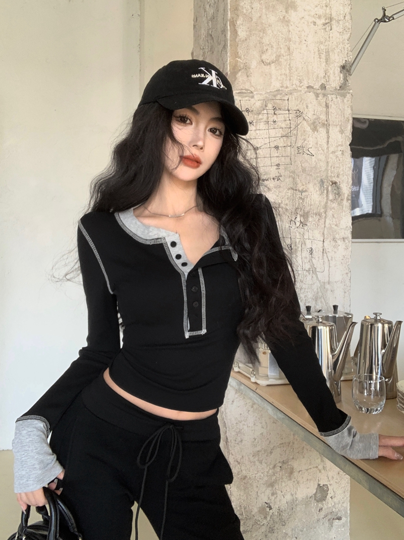 실제 가을과 겨울 핫 걸 스타일 레트로 스 플라이 싱 대비 색상 슬림 안내 내부 긴팔 짧은 니트베이스 셔츠 탑