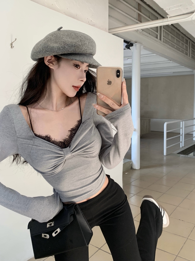 진짜 가격의 섹시한 핫 걸 스타일 U-Neck 스 플라이 싱 레이스 ​​3 차원 활로 묶인 코키 트베이스 셔츠 탑