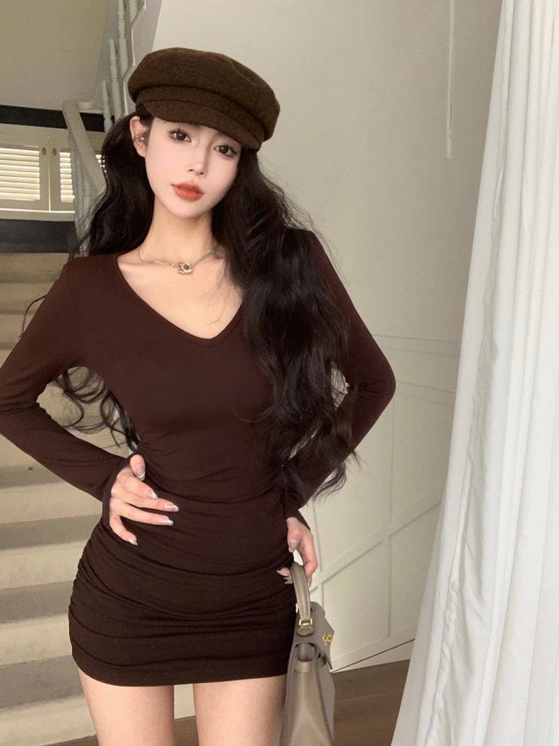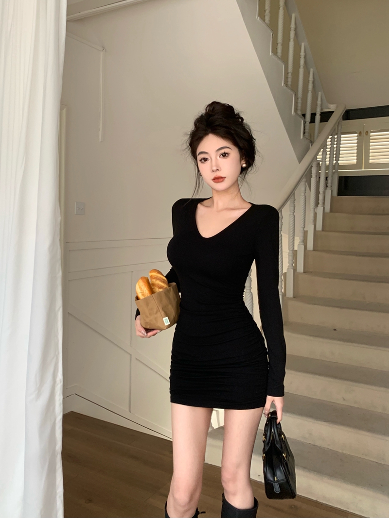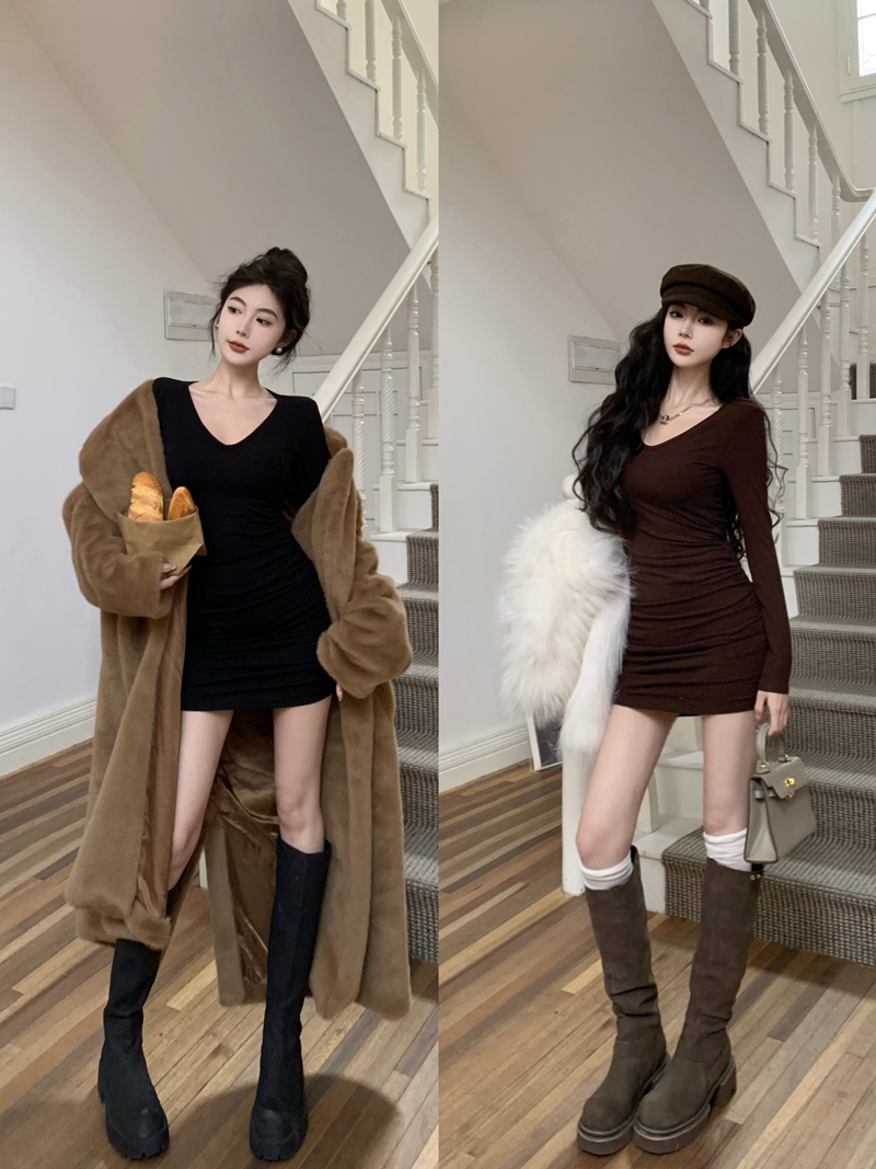 진짜 가격 순수한 섹시한 여자 스타일 슬림과 벨벳 내부 V- 넥 하단 바닥 어깨 패드 드레스