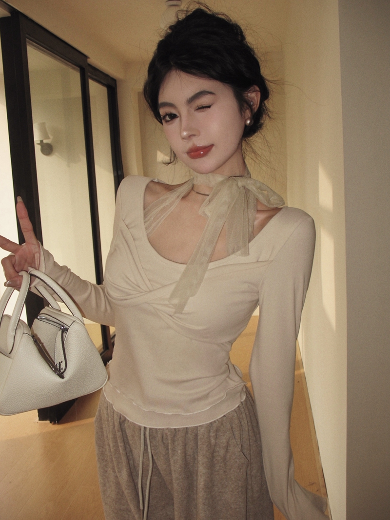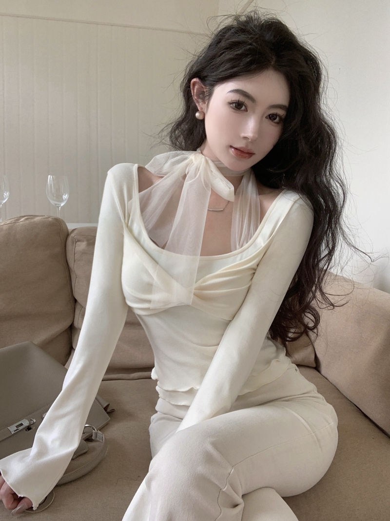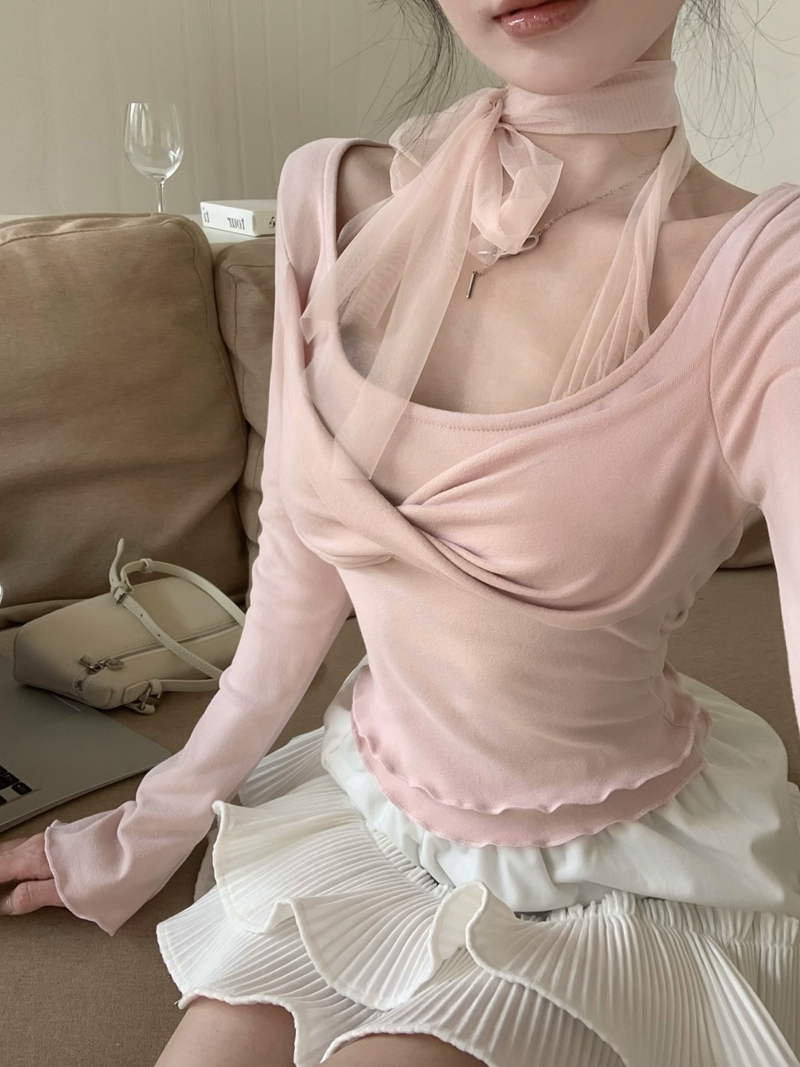 Real-Price Spring New Sweet Pure Desire U-Neck 스 플라이 싱 메시 가짜 두 피스 연삭 내부 바닥 셔츠 탑