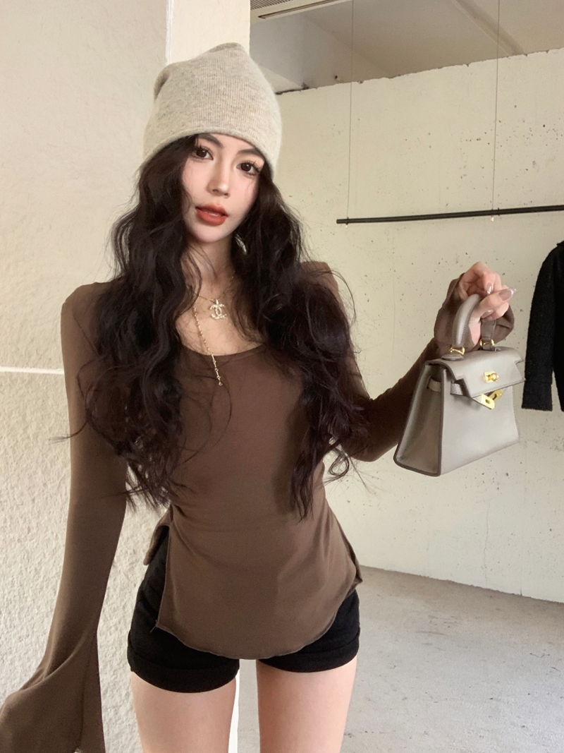 실제 가을과 겨울 트럼펫 슬리브 ​​섹시 벨벳베이스 셔츠 여성용 디자인 슬림 한 슬림 안쪽 어깨 패드 탑