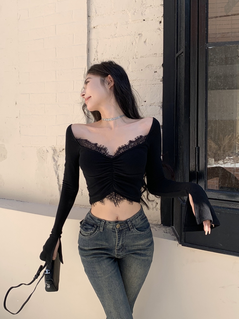 진짜 가격 샷과 실제 가격 섹시한 핫 걸 스타일 v- 넥 레이스 스 플라이드 플레어 슬리브 안에 타이트베이스 셔츠