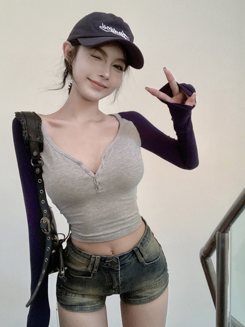 실제 가을 가을 유럽 및 미국 스타일의 V- 넥 대비 컬러 래그 슬리브 긴팔 티셔츠 여성을위한 순수한 가슴.