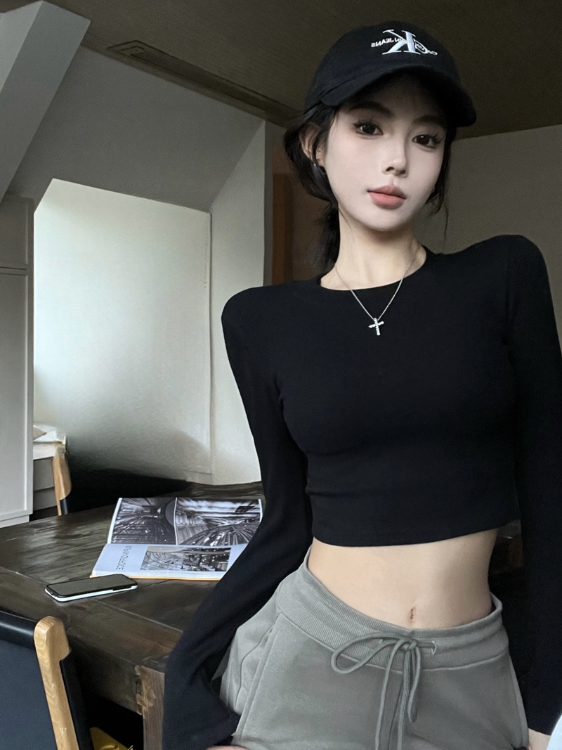 실제 가을 가을 핫 걸 스타일, 슬림하고, 키가 크고, 탄력적이며, 단단한 짧은 짧은, 모피 머리의 긴 소매 티셔츠, 외부 및 내부베이스 셔츠.
