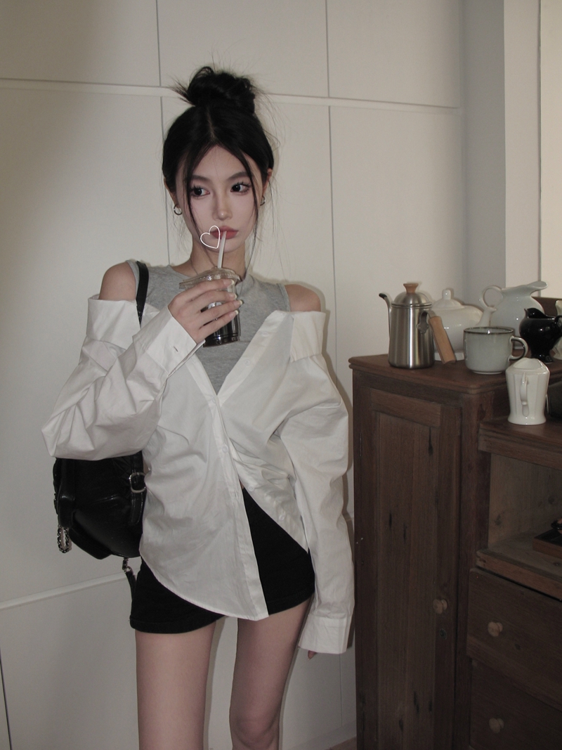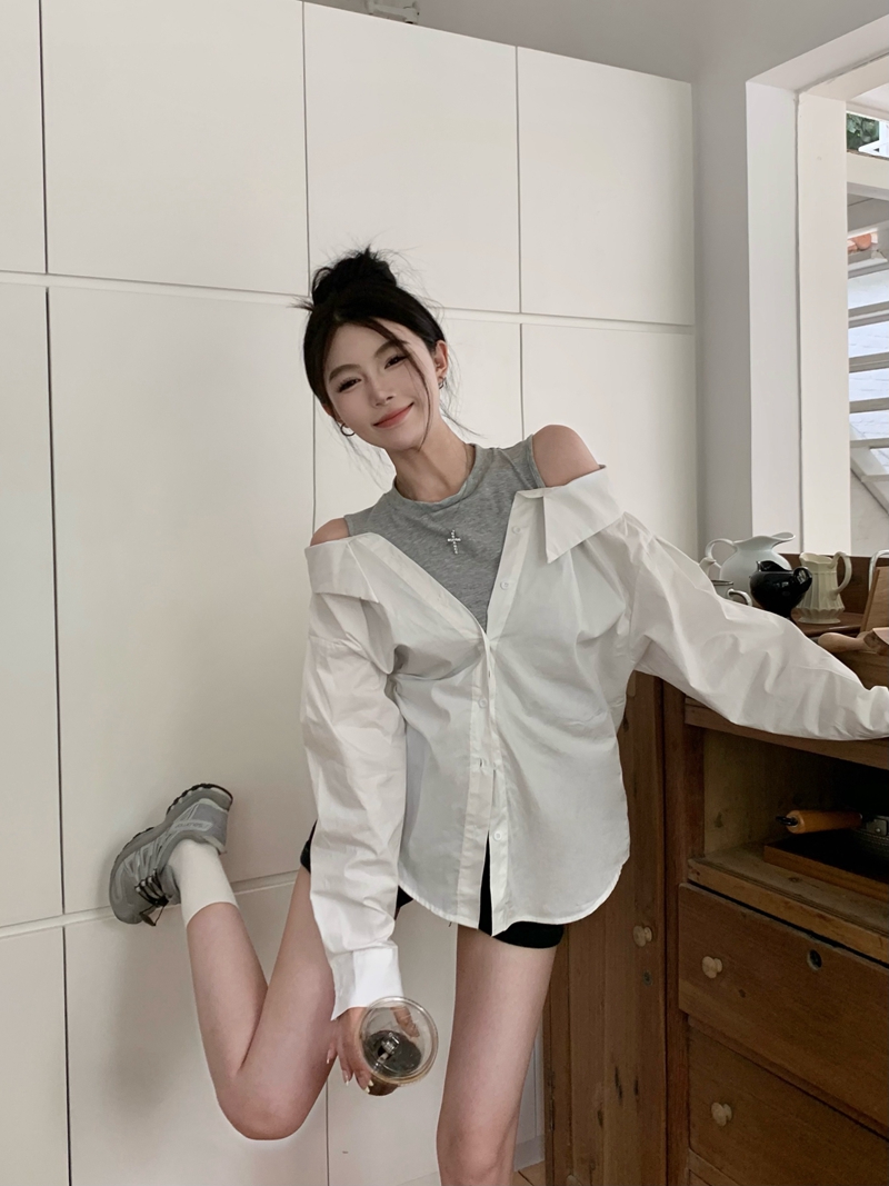 Real-Price Hot Girl 스타일 디자인 짧은 니트 조끼 스 플라이 싱 미드 길이 셔츠 가짜 2 피스 탑