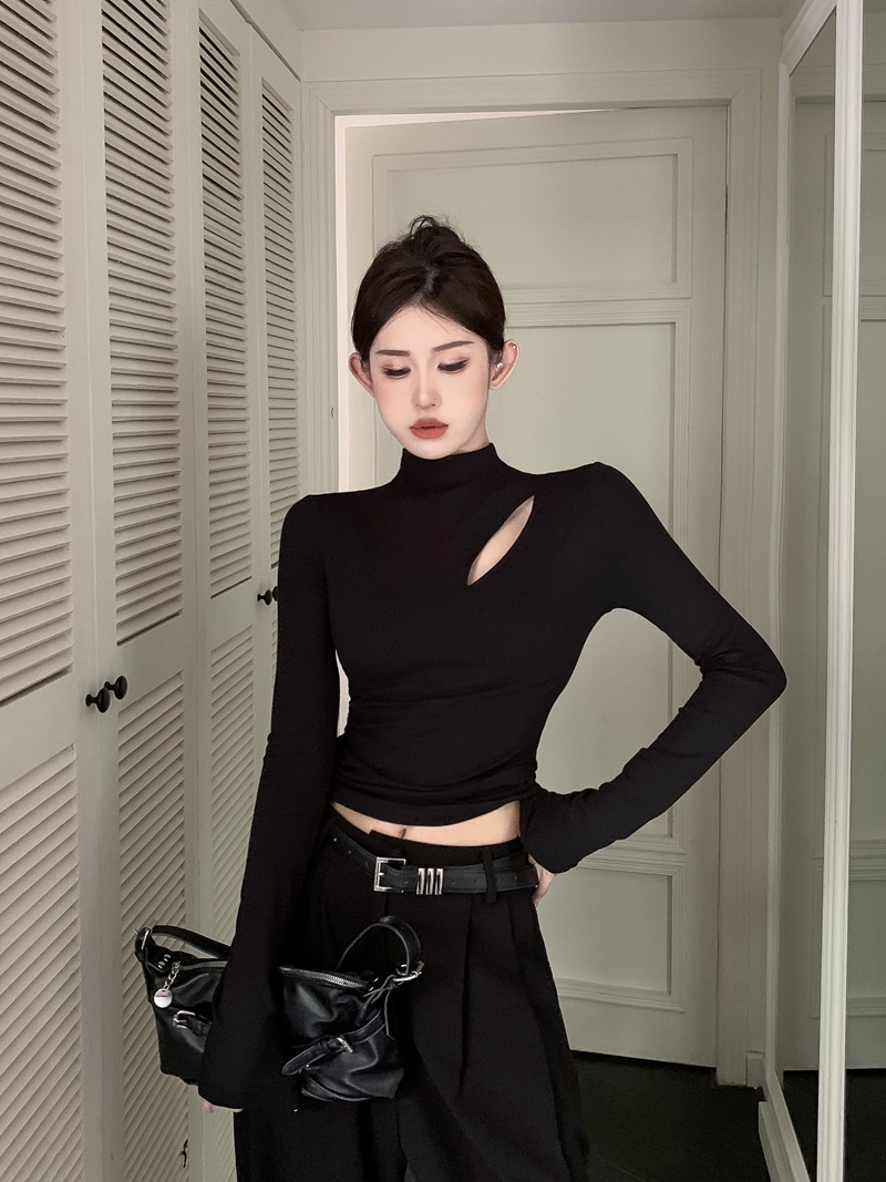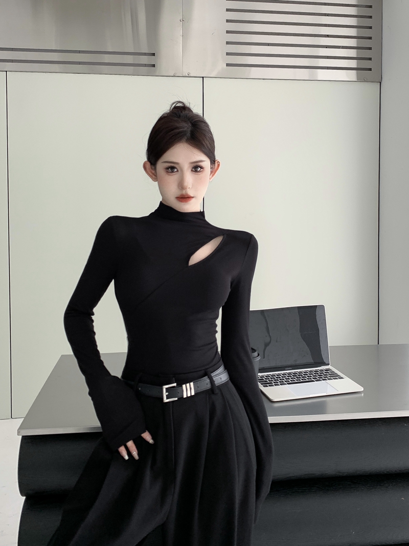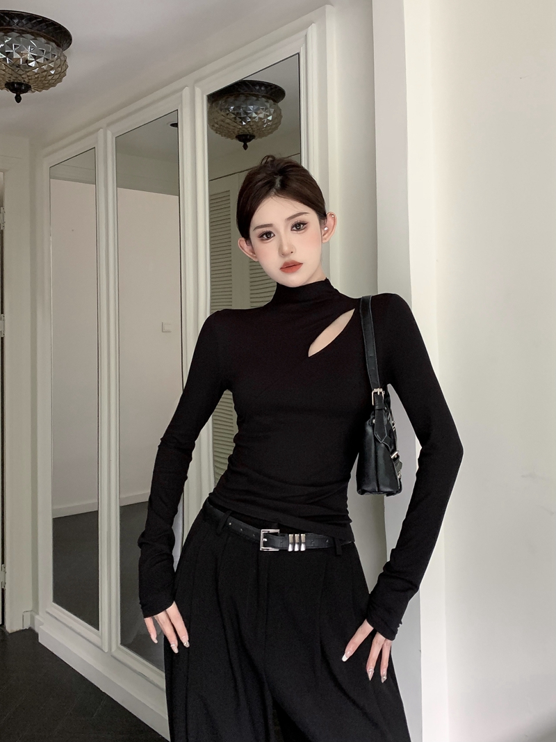 실제 고가의 가을과 겨울 감각 반 고위 목 속 중공이 긴팔 티셔츠를 조심스럽게 슬리밍하는 내부베이스 셔츠