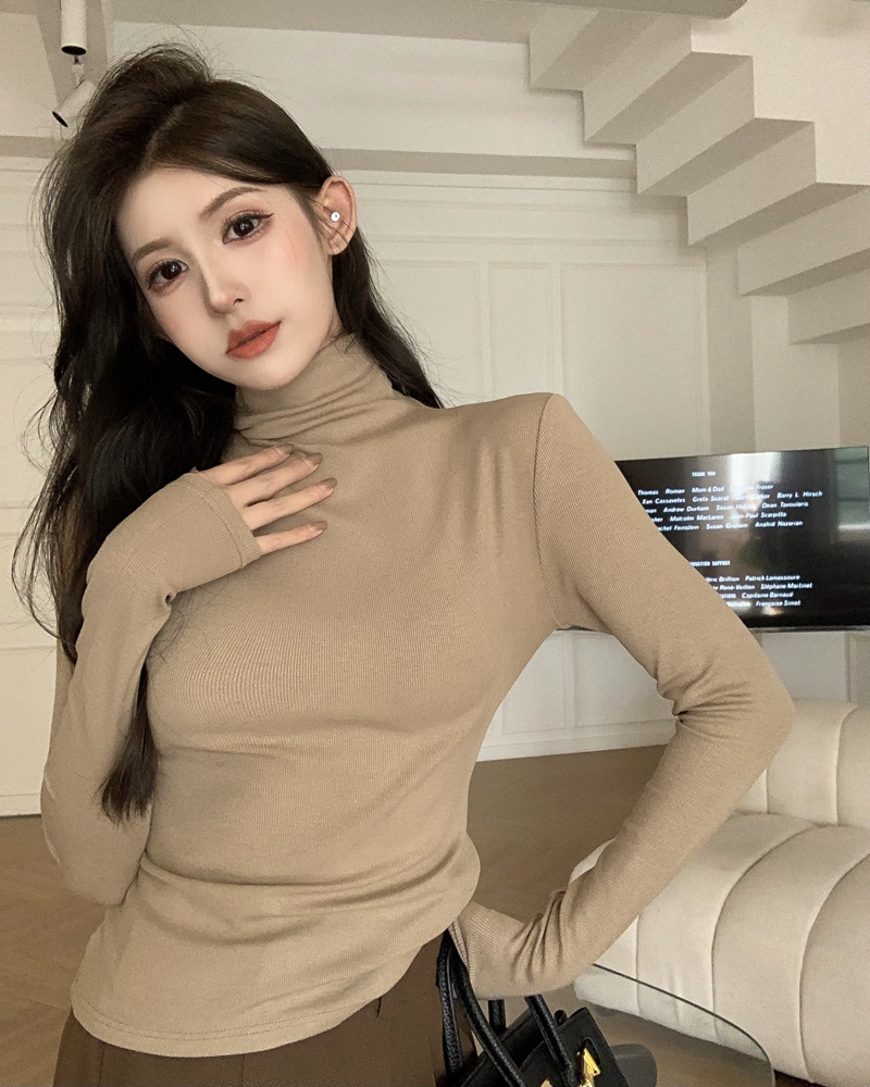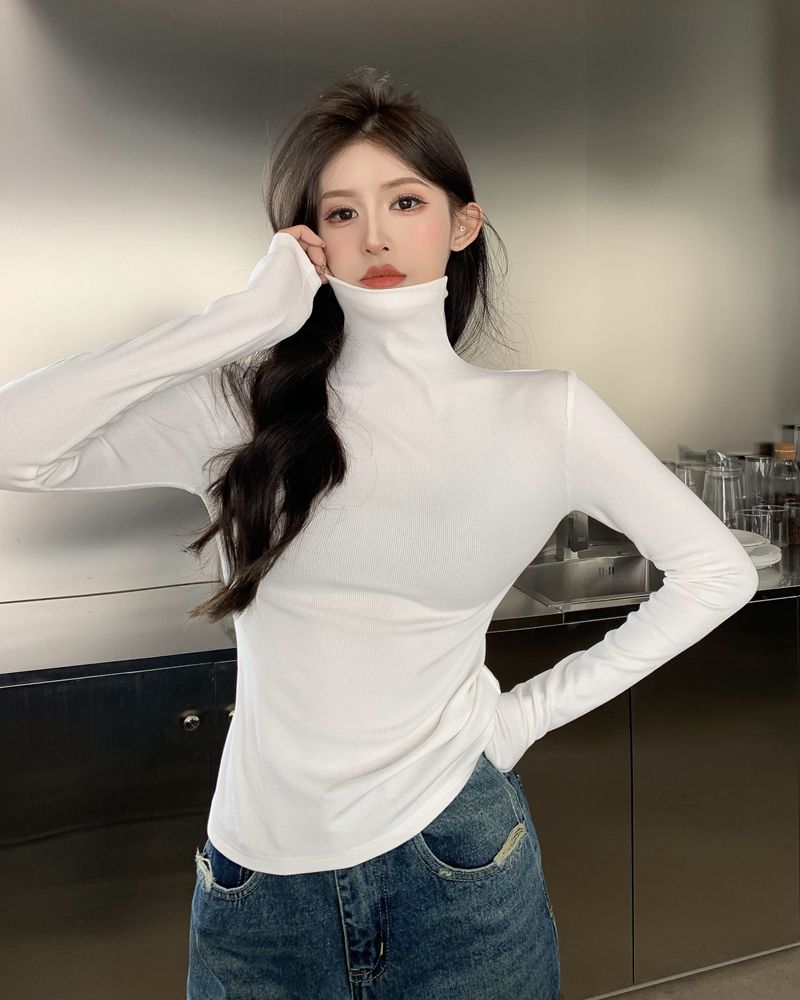 실제 가을과 겨울 핫 소녀 Turtleneck, 모피 굽는 나사산 슬림하고 짧은 긴 소매 안쪽 하단 셔츠 탑