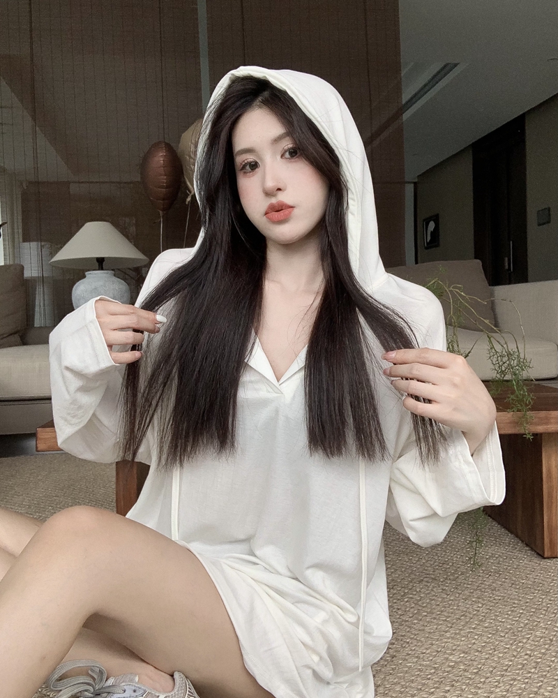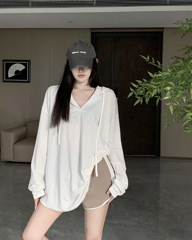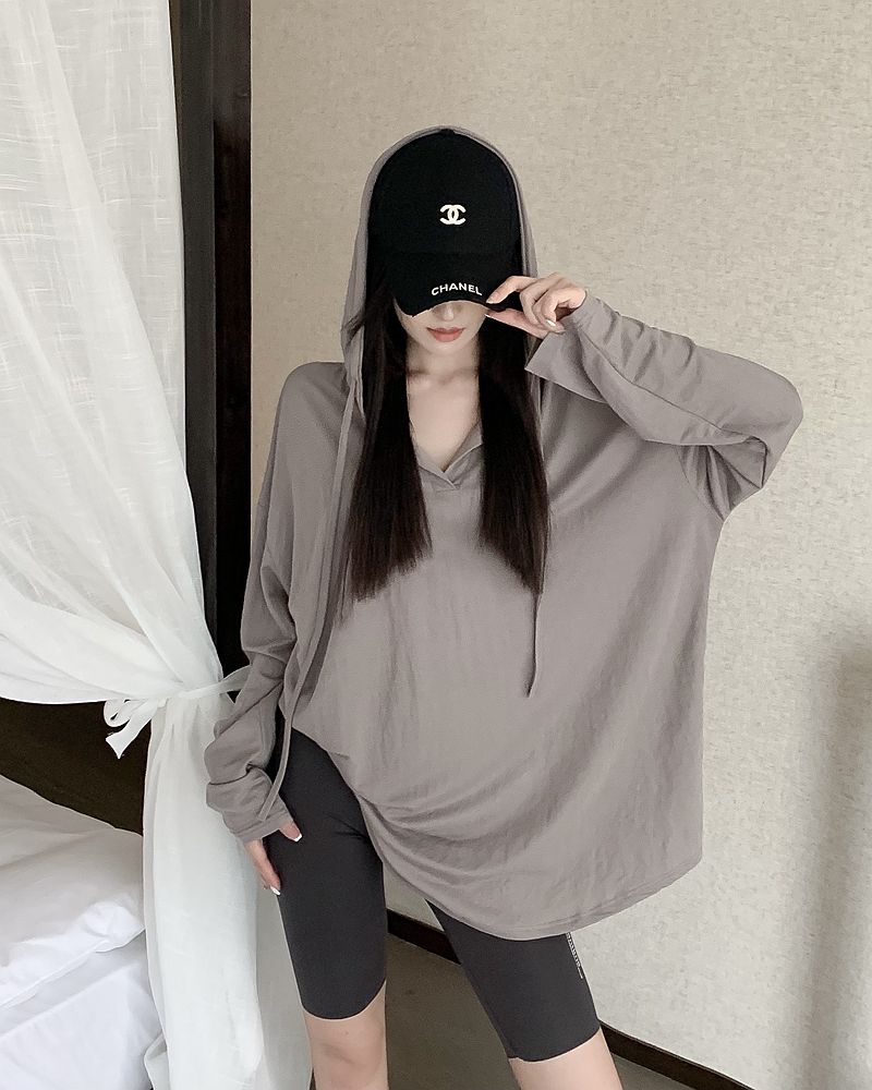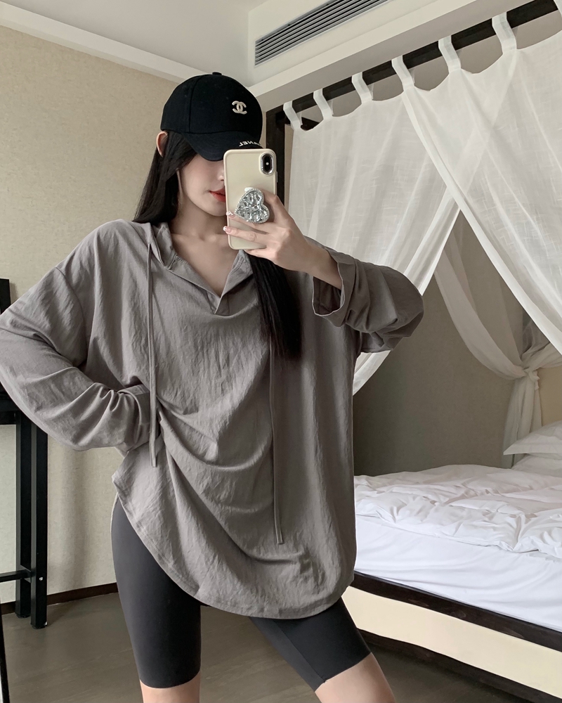 실제 가격의 여름 핫 걸 스타일 얇은 느슨한 캐주얼 후드가있는 긴 슬리프 티셔츠 여성을위한 드레이프 및 시원한 태양 보호 탑