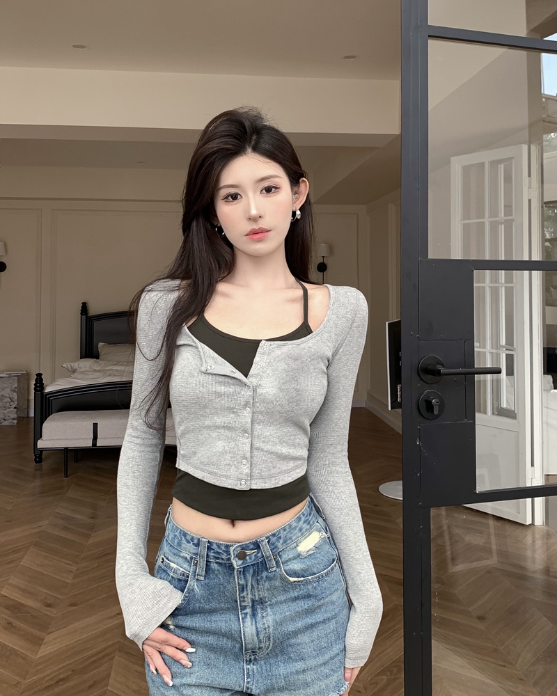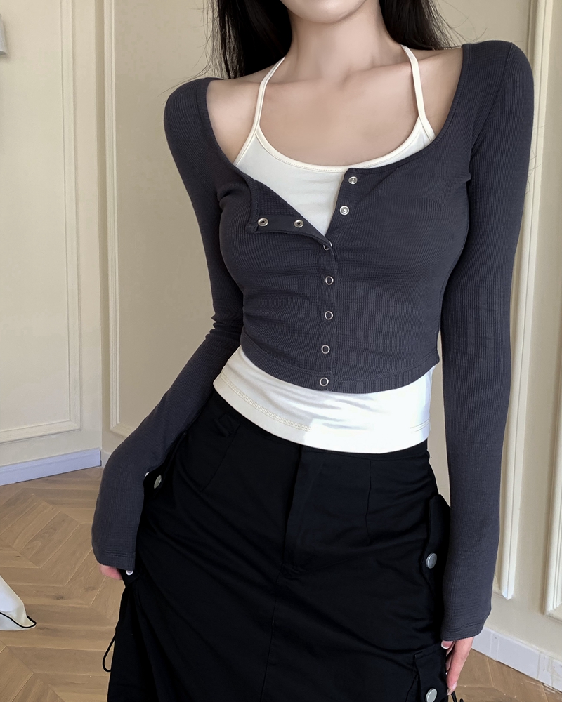 실제 가격이 책정 미국 복고풍 핫 걸 스타일 얇은 슬림 서스펜더 짧은 긴 소매 티셔츠 가짜 2 피스 선 스크린 탑