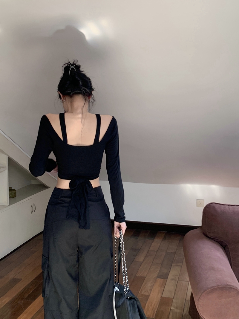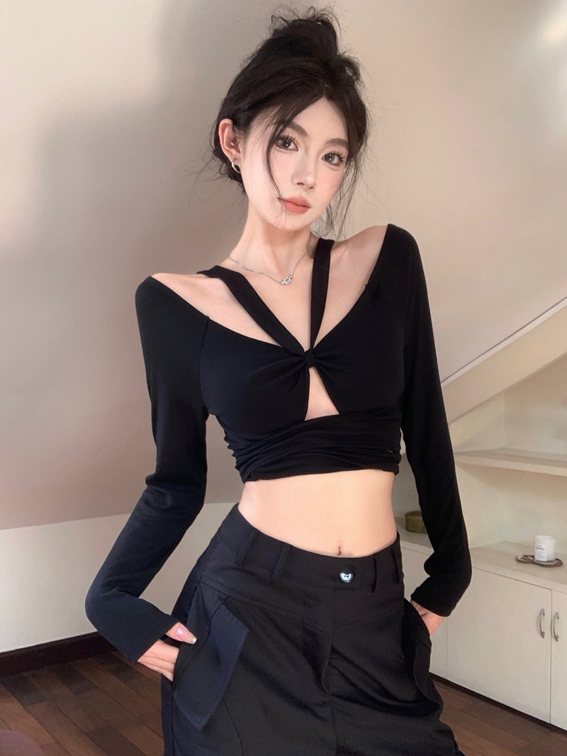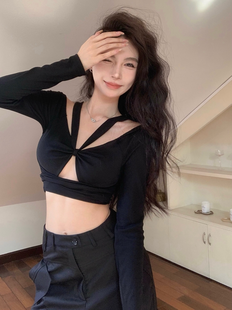 실제 사진 및 실제 가격 Lisa 같은 뜨거운 소녀 스타일 블랙 중공 레이스 긴팔 티셔츠 디자인을 슬림하고 배꼽 꼭대기로 보이게합니다.