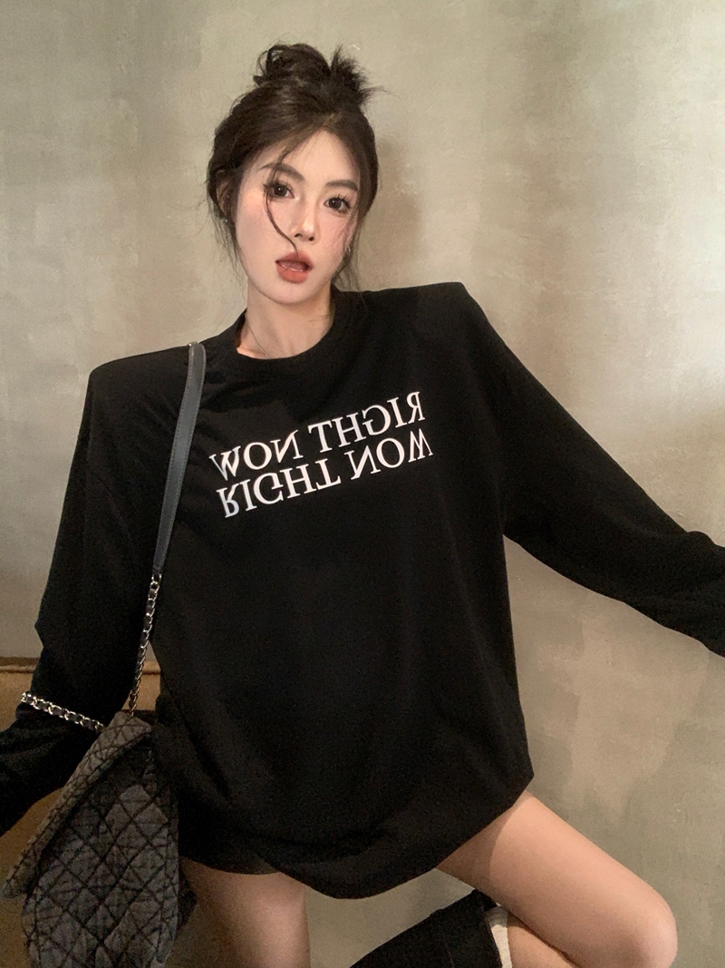 Real-Erice Hot Girl 스타일 편지 인쇄 캐주얼 느슨한 어깨 패드 긴 슬리브 티셔츠 여자 와이드 플레이트 최고의 트렌디