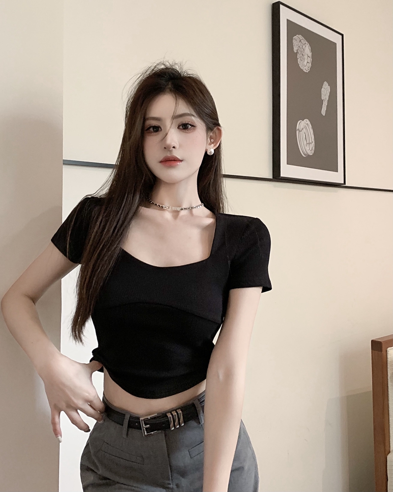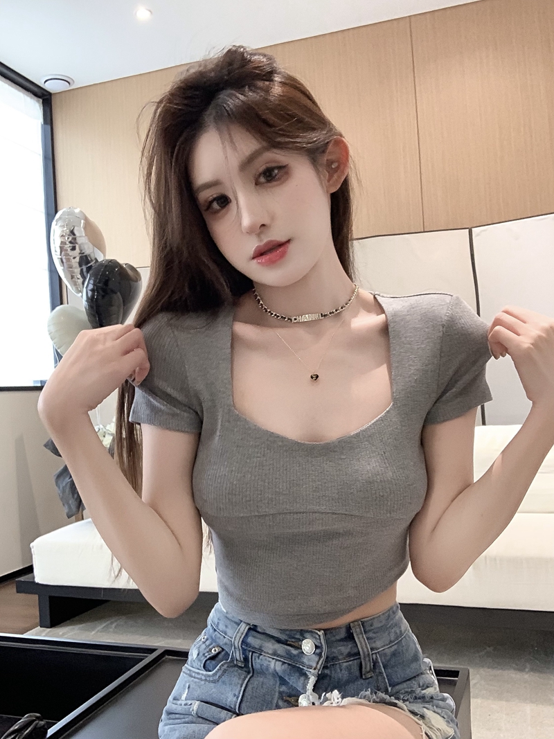 여름의 진짜 샷 여름 순수한 섹시한 여자 스타일 스퀘어 칼라 로우 컷 짧은 짧은팔 티셔츠 in vavel-displayed top