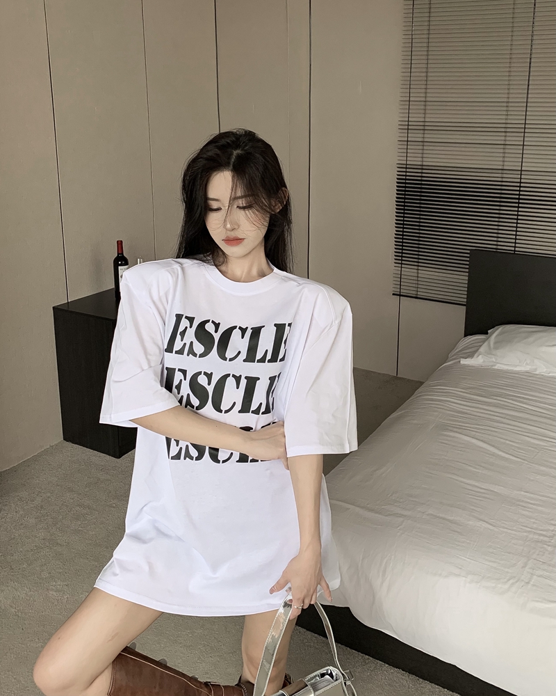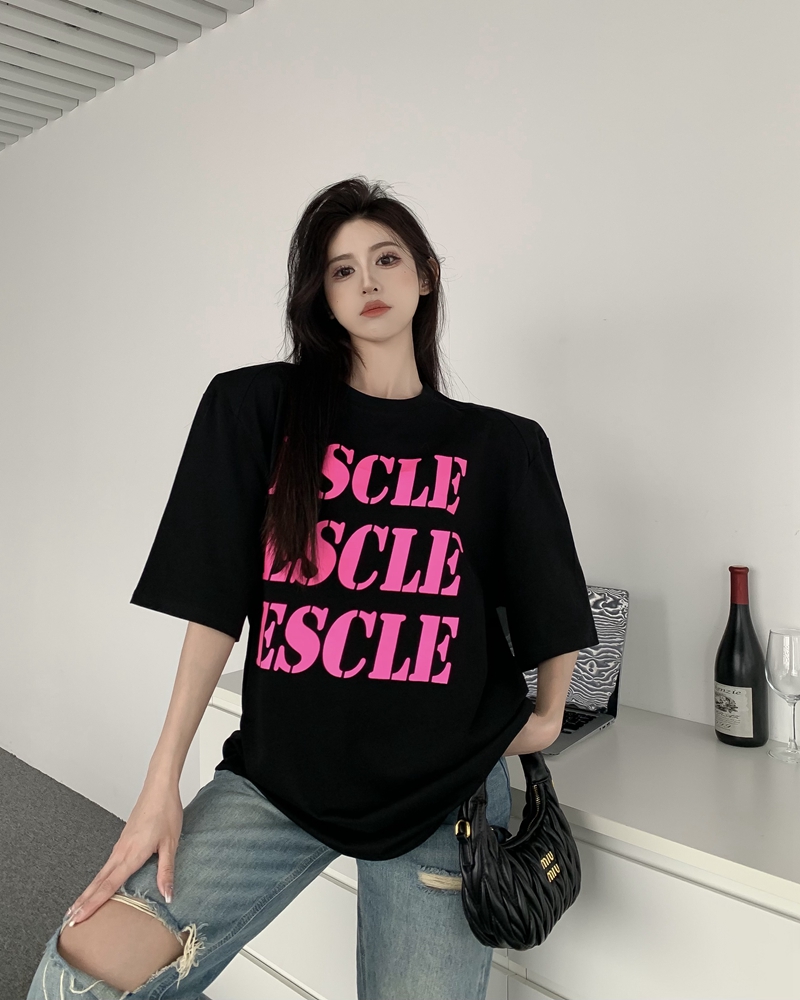 여름 홍콩 스타일의 실제 샷 유력한 레터 인쇄 느슨한 넓은 버전 캐주얼 짧은 슬라이드 티셔츠 어깨 패드 탑 트렌디
