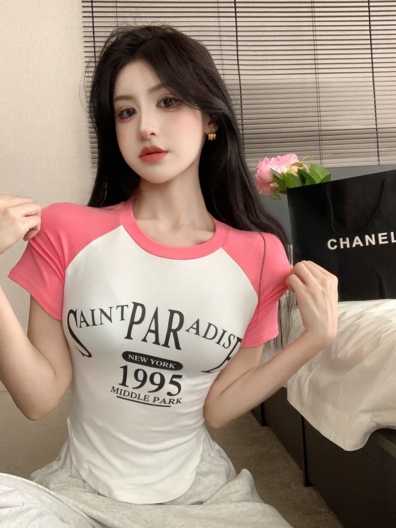 여름 핫 걸 스타일 편지 인쇄 vaguero 슬리브 짧은 짧은 소매 티셔츠 가슴과 배꼽 꼭대기