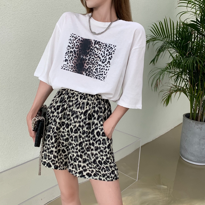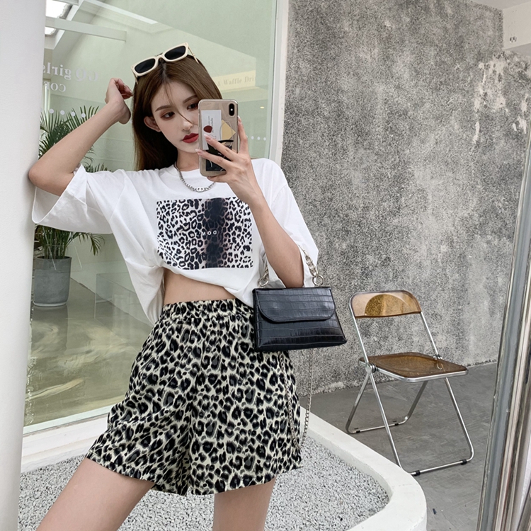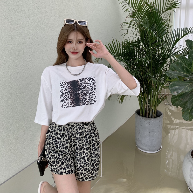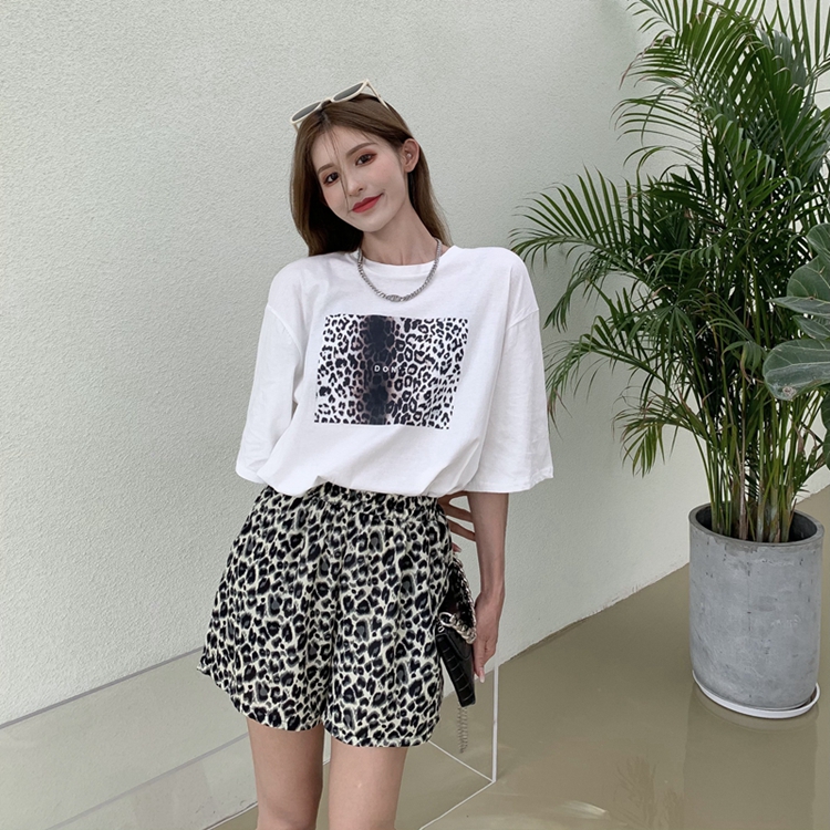 여름 홍콩 스타일의 실제 사진 레오파드 프린트 느슨한 짧은팔 티셔츠 + 하이 웨이스트 슬림 쉬폰 표범 프린트 넓은 다리 반바지 세트
