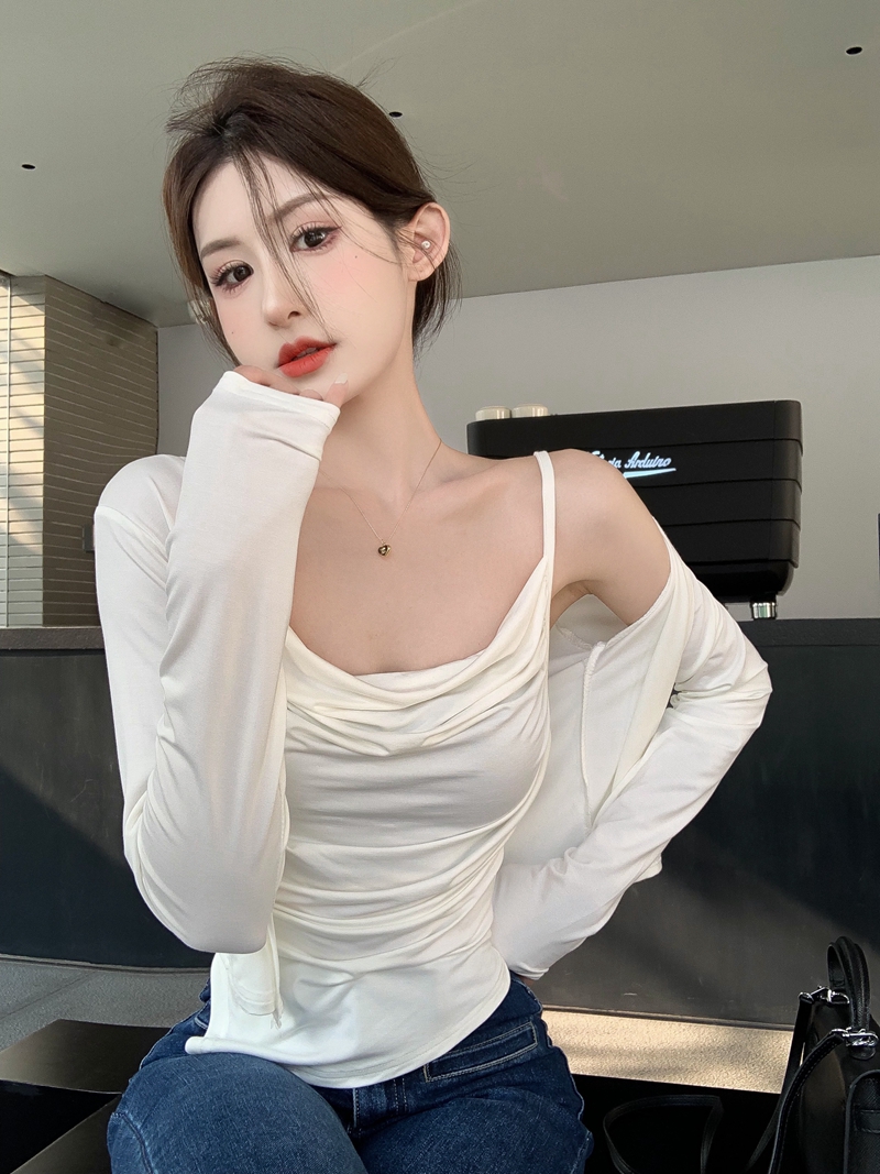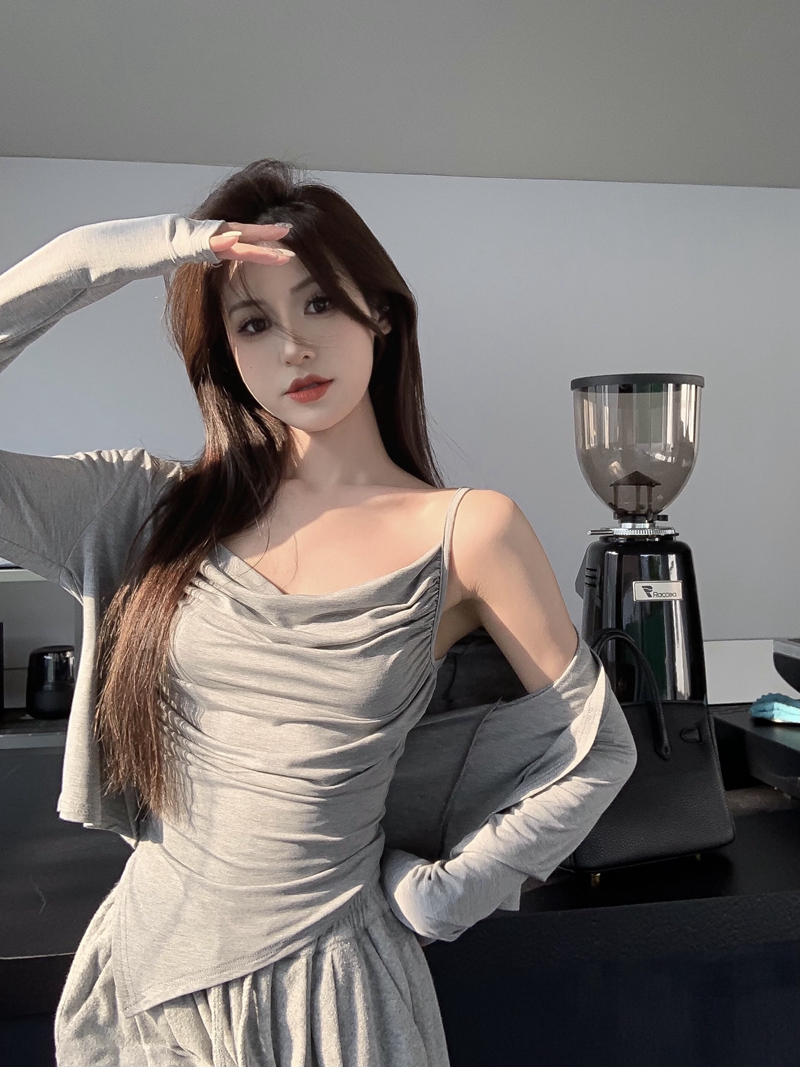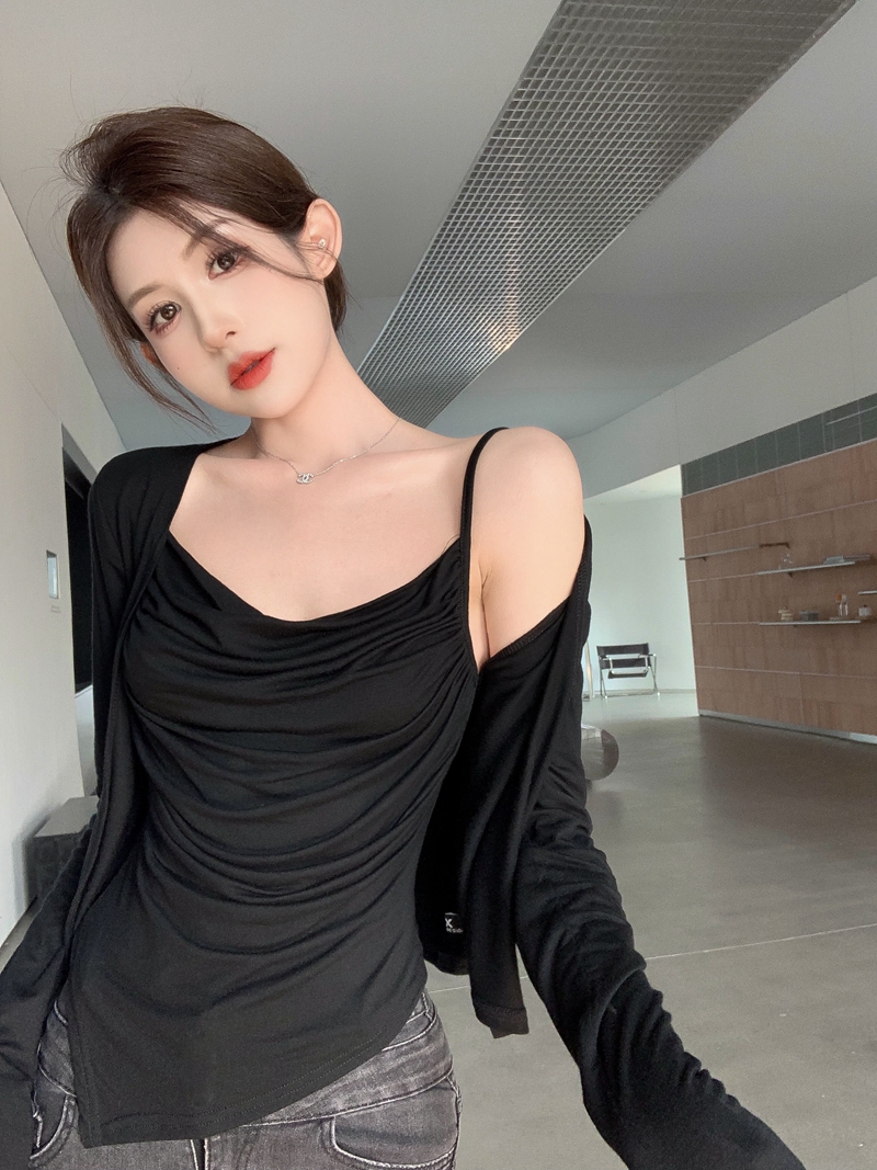 봄과 여름의 실제 샷 새로운 순수한 섹시한 여자 스타일 가슴 슬링 서스펜더 조끼 + 외부 카디건 패션복