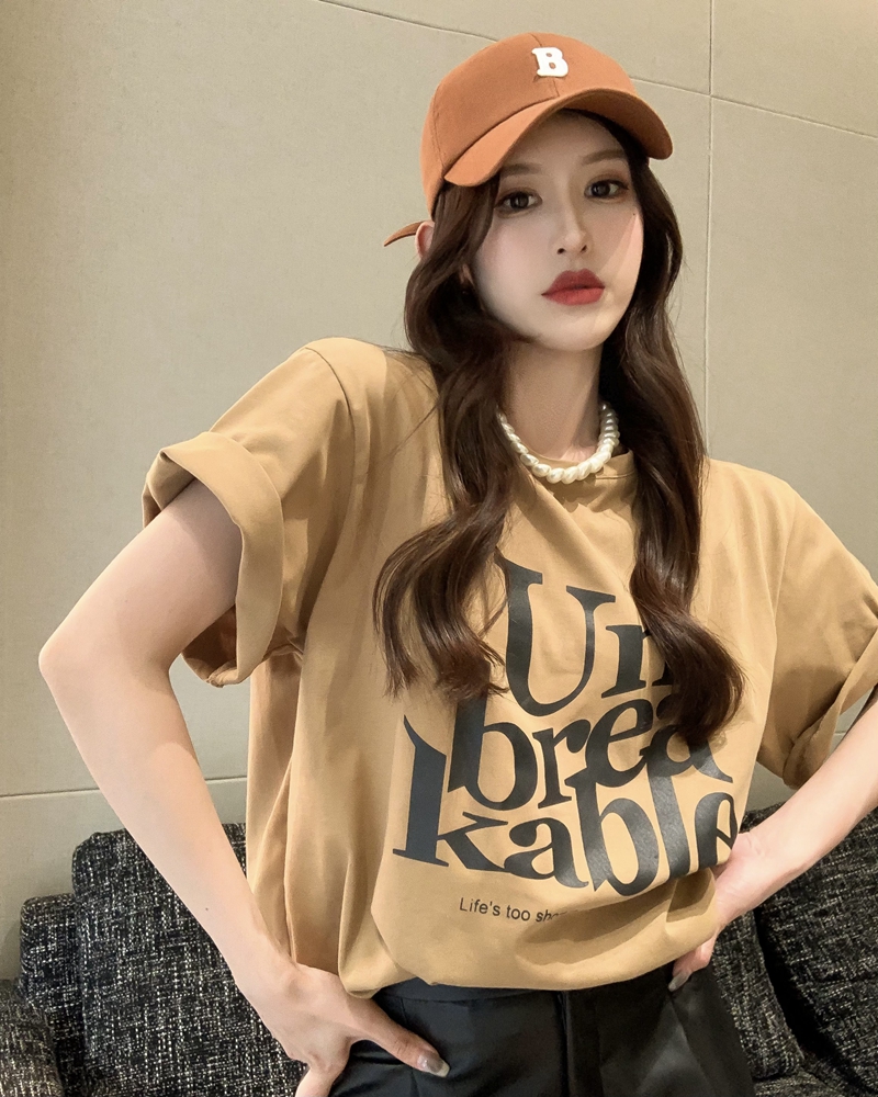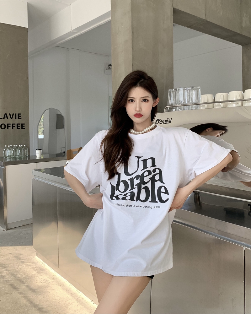 실제 봄 스타일의 세련된 편지 인쇄 느슨한 중간 길이 와이드 버전 순수면 단락 티셔츠 오버 사이즈 상단