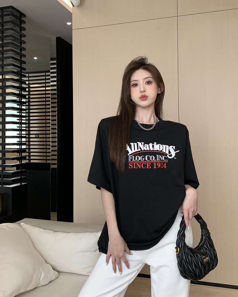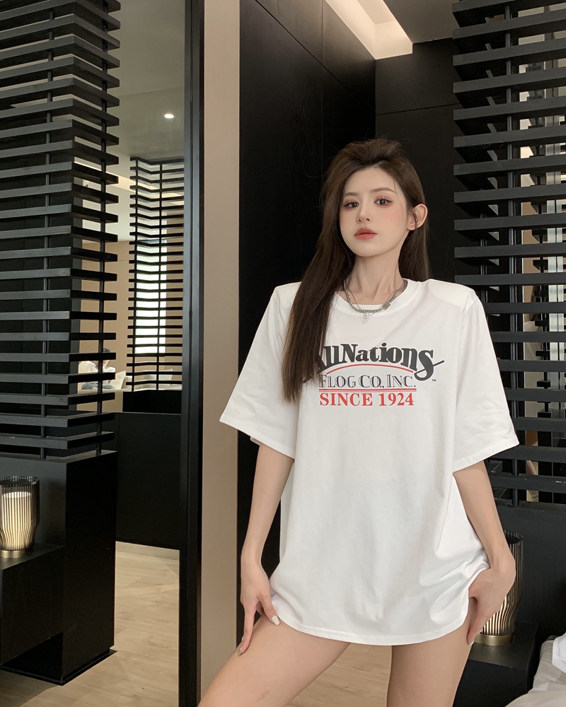 여름 홍콩 스타일의 레트로 레터 인쇄 느슨한 넓은 버전 중간 길이의 짧은 소매 티셔츠 어깨 패드 탑 트렌디