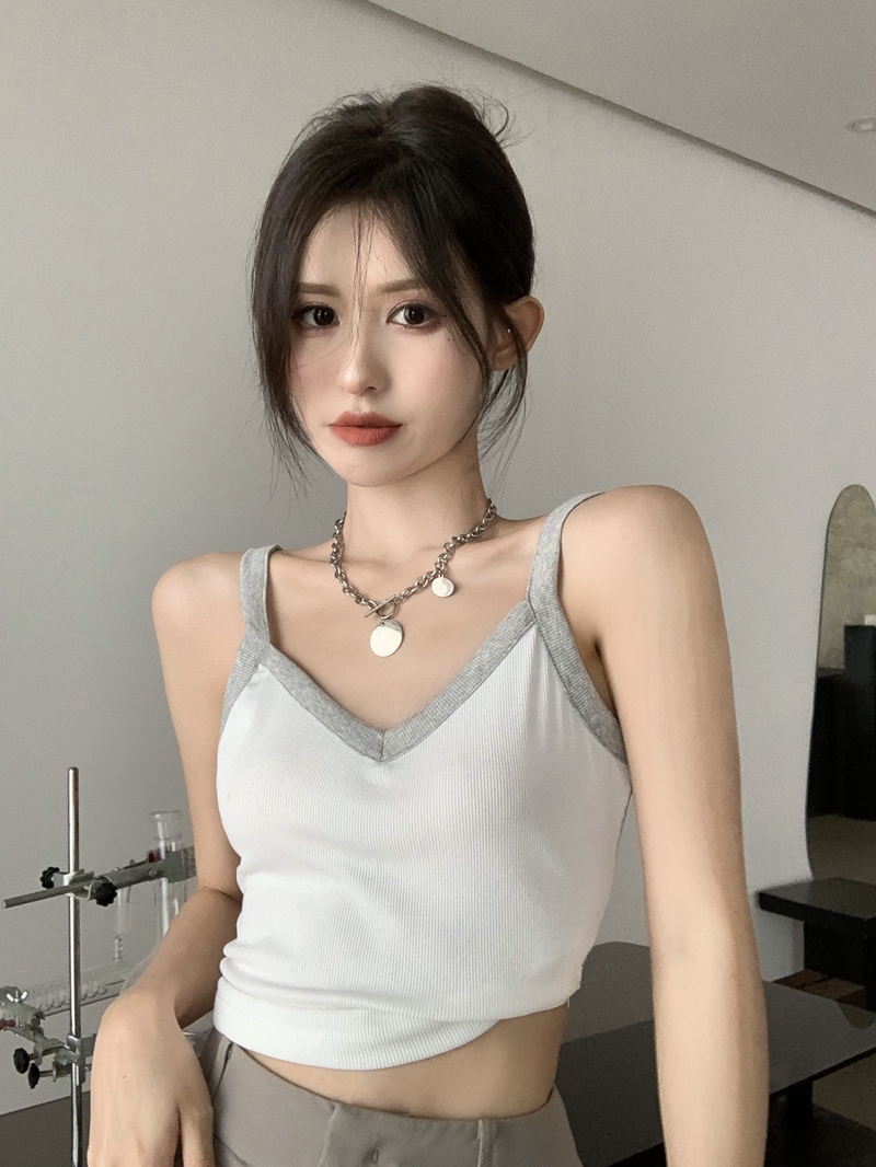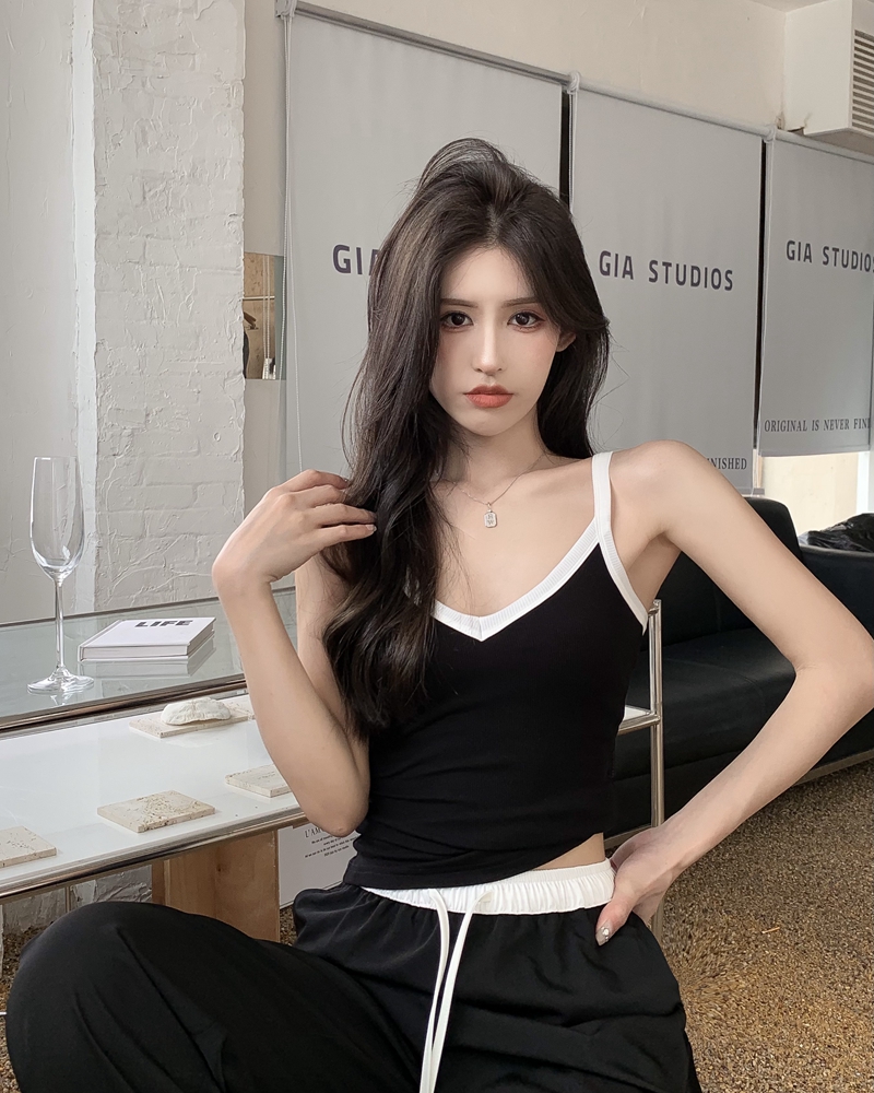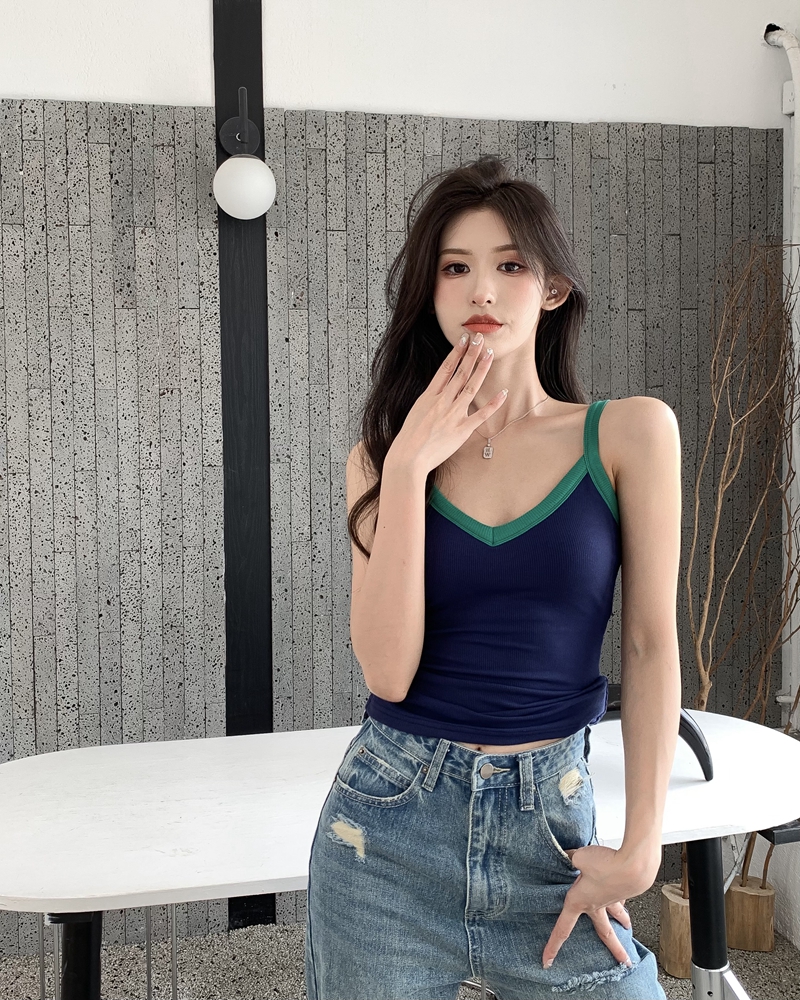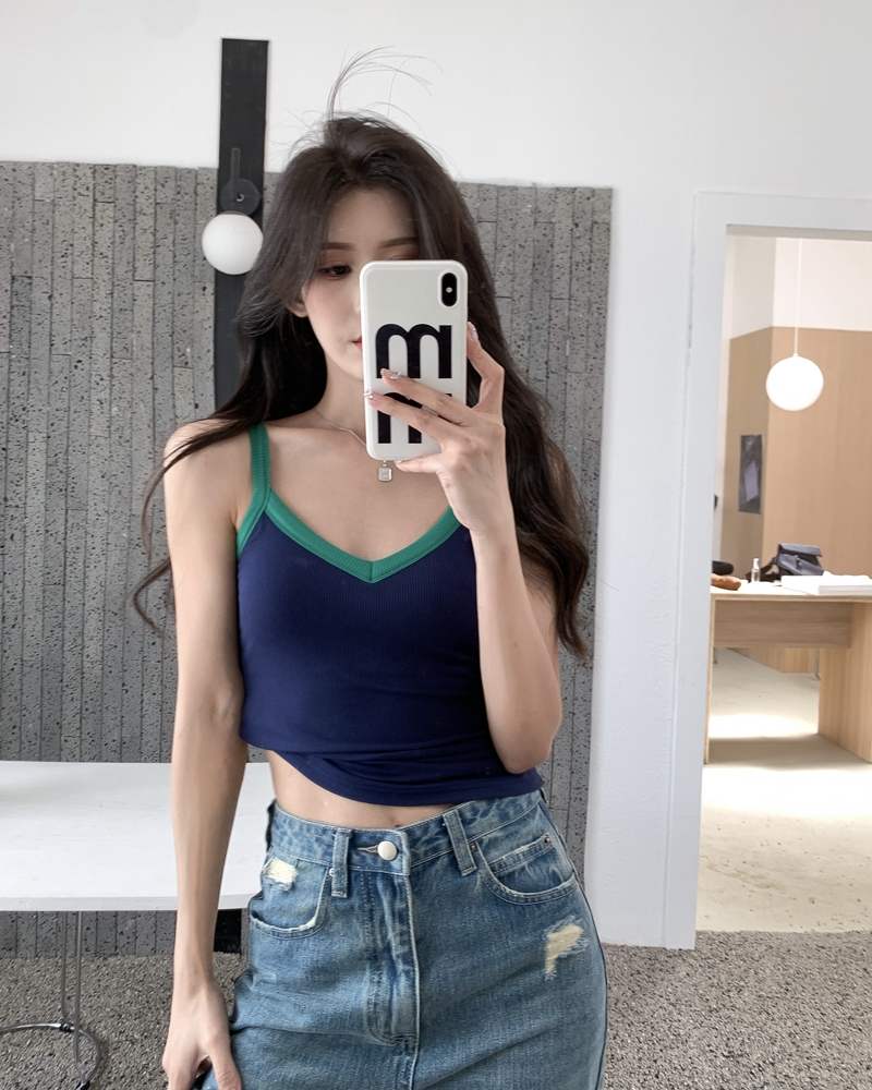 스프링 홍콩 스타일의 실제 사진 유럽과 미국 대조적 인 컬러 슬림 페이퍼 맨 서스펜더 조끼 ins 짧은 배꼽 꼭대기