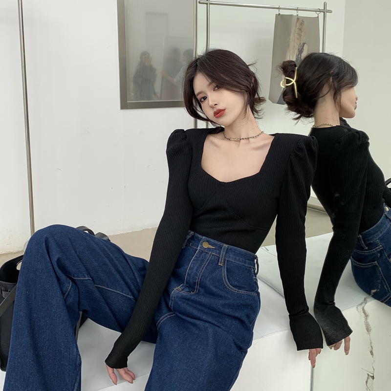 가을과 겨울 홍콩 스타일 스퀘어 칼라 퍼프 슬리브의 실제 사진 촬영 사진