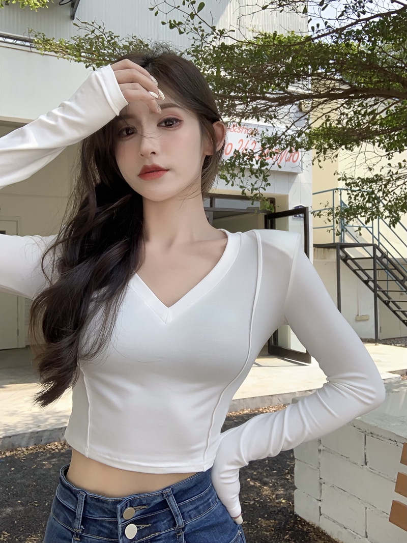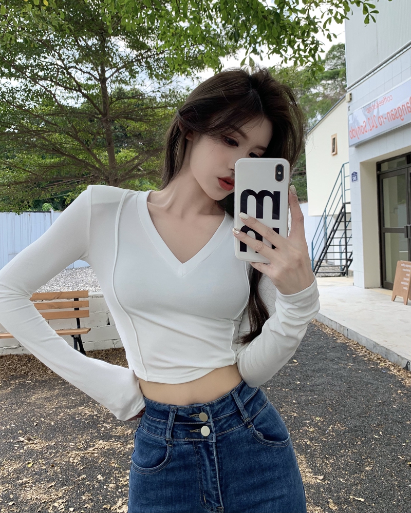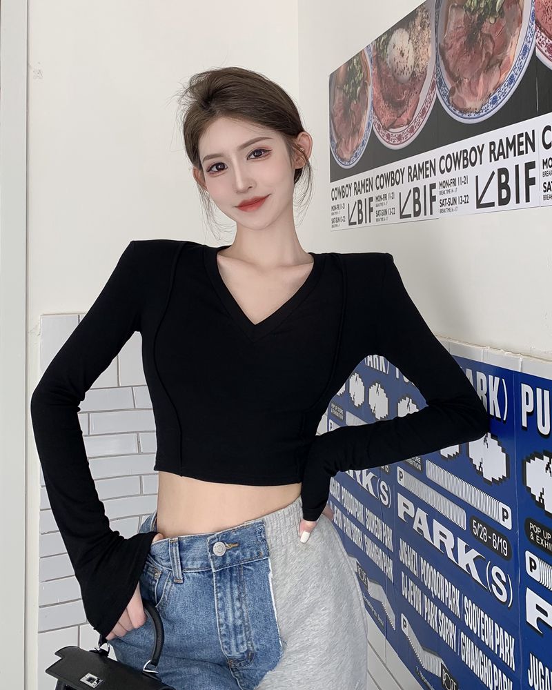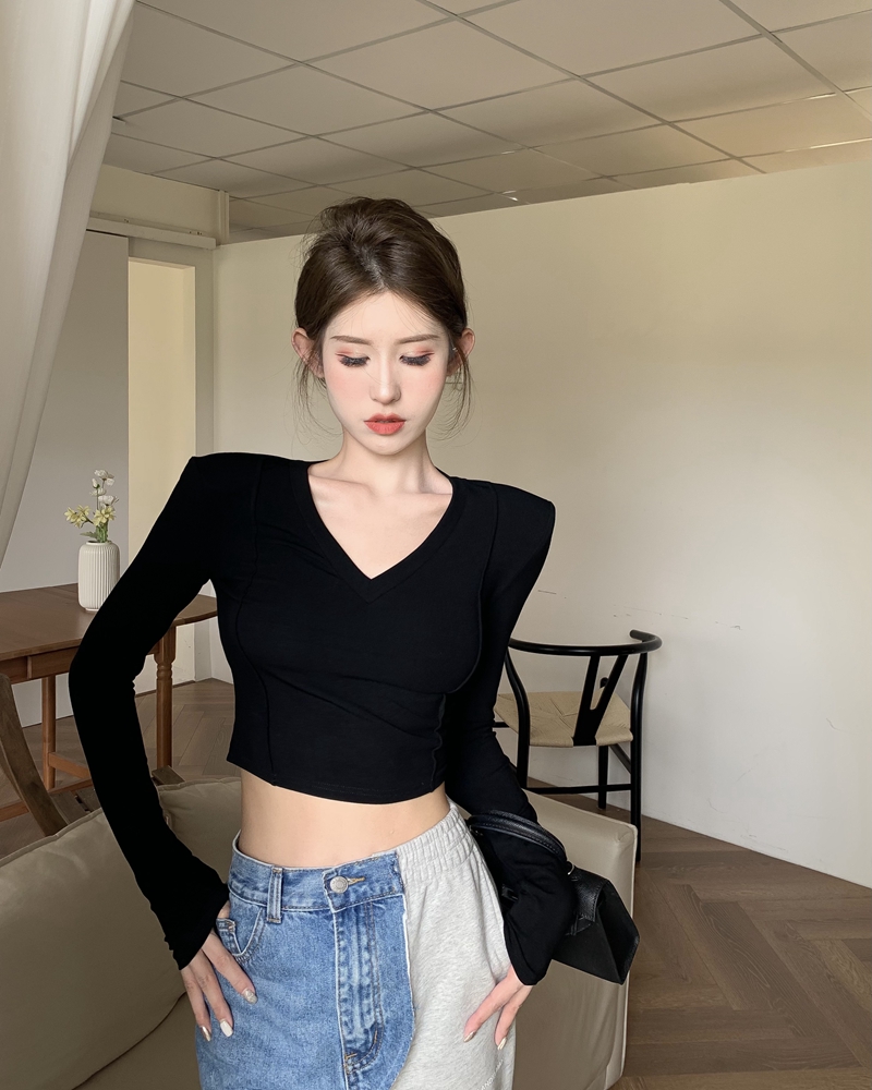 실제 수명 스프링 뉴 홍콩 스타일의 핫 걸 스타일 V- 넥 타이트한 짧은 어깨 패드 긴 슬리브 티셔츠 in 배꼽 노출 상단