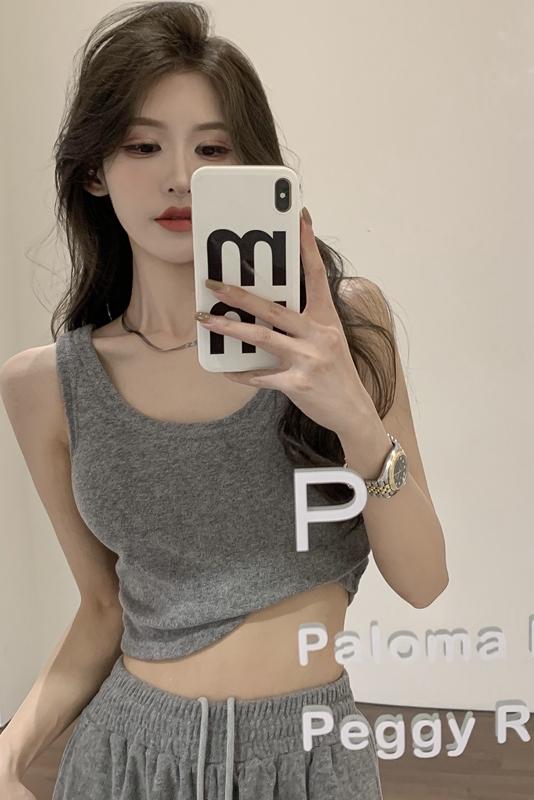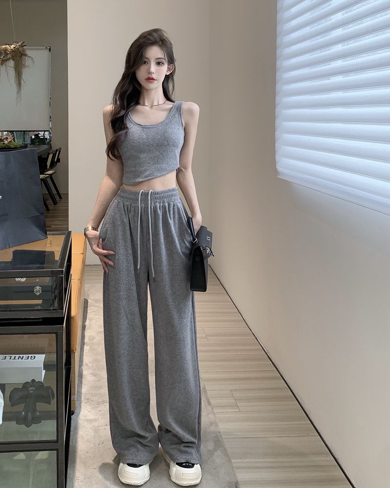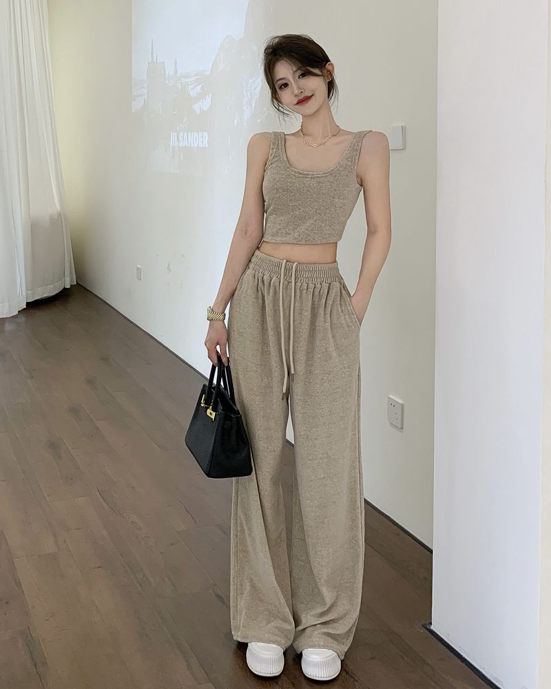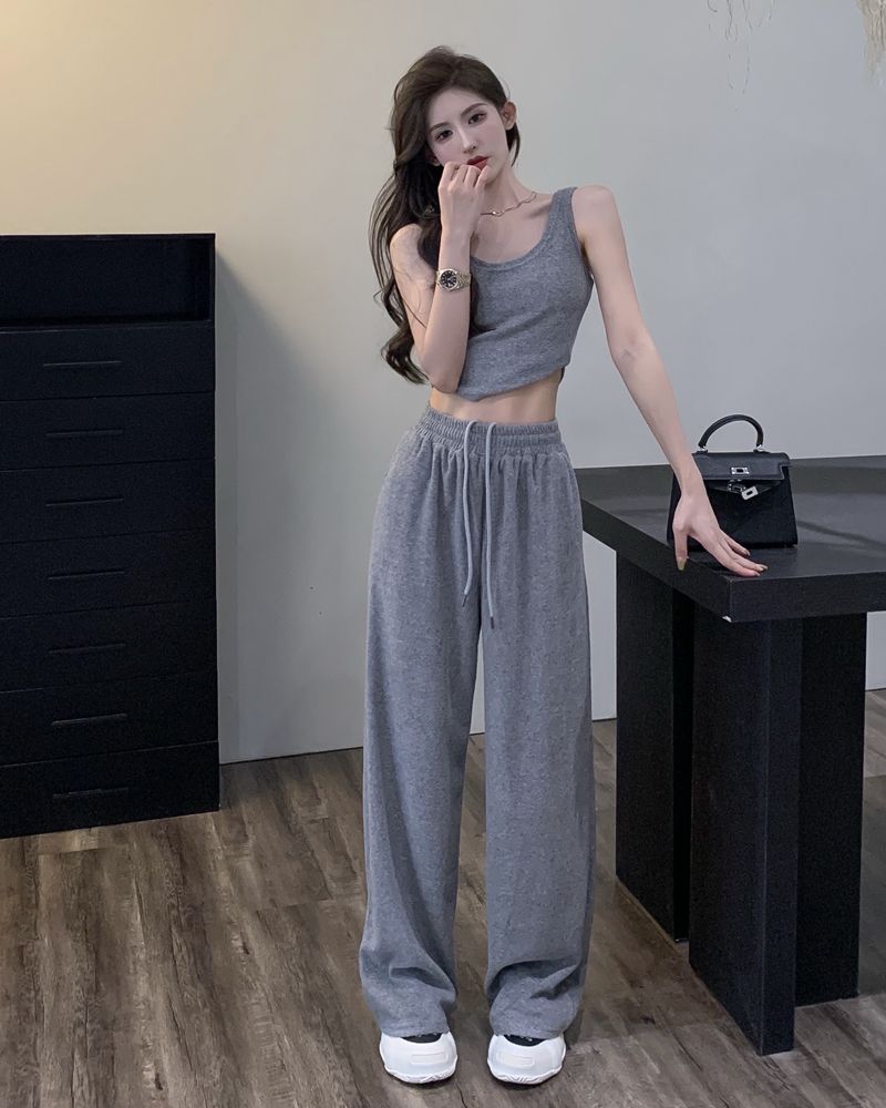 실제 수명 봄 게으른 순수하고 정욕적인 짧은 배꼽 조끼 + 높은 허리가 넓은 다리 바지 세련된 니트 정장
