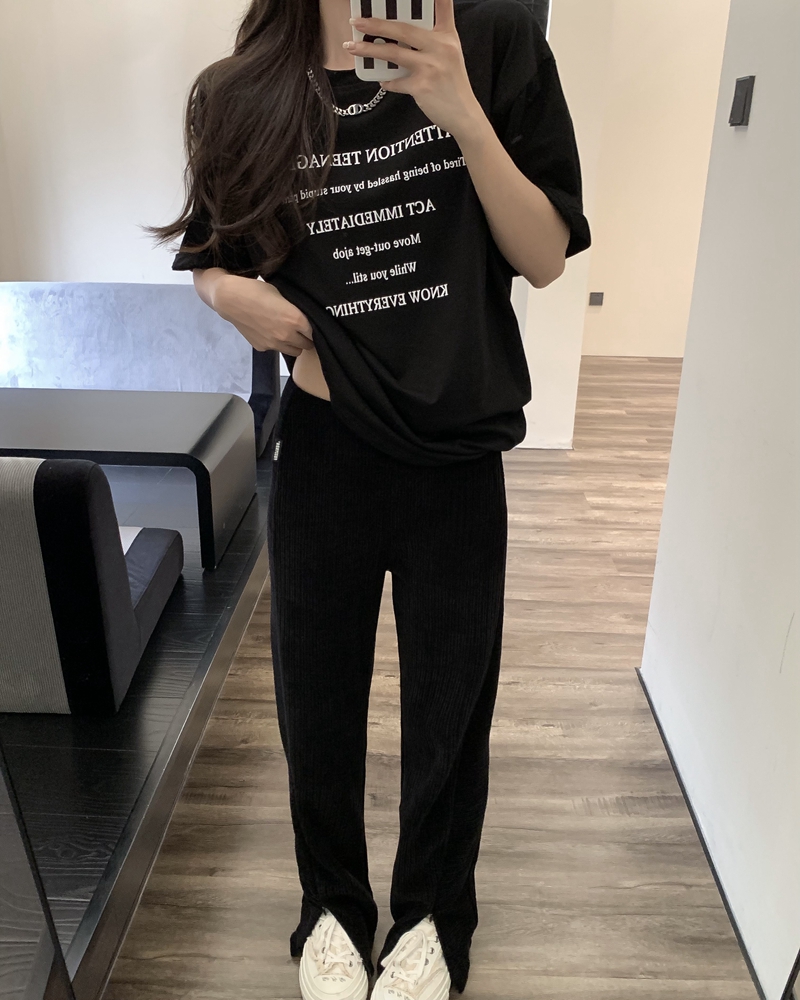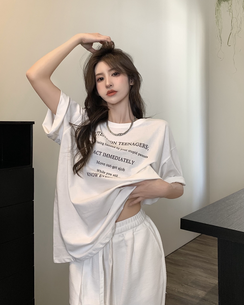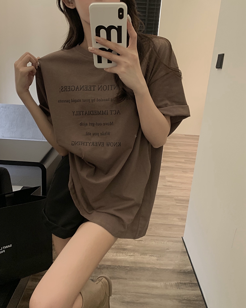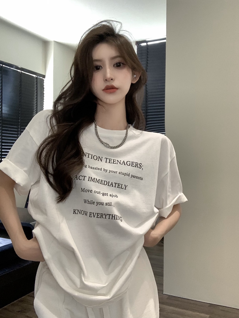 실제 수명 봄 뉴 홍콩 스타일의 편지 인쇄 이중 원사 면화 느슨한 캐주얼 짧은 소매 티셔츠 ins 다재다능한 최고 트렌디