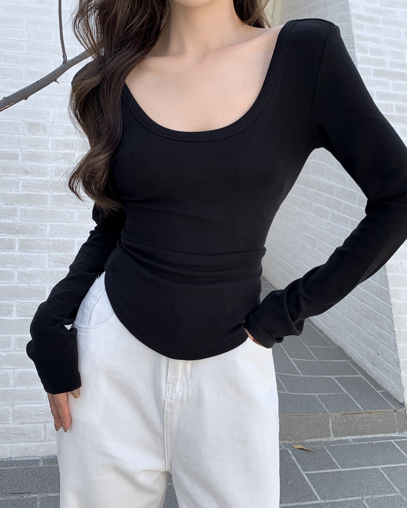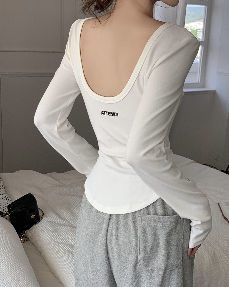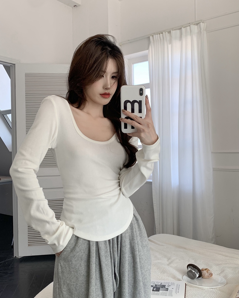가을 홍콩 스타일의 실제 사진 간단한 글자, 등이없는 U-Neck 긴팔 티셔츠 ins 슬림 한 탄성 슬림 안쪽베이스 셔츠