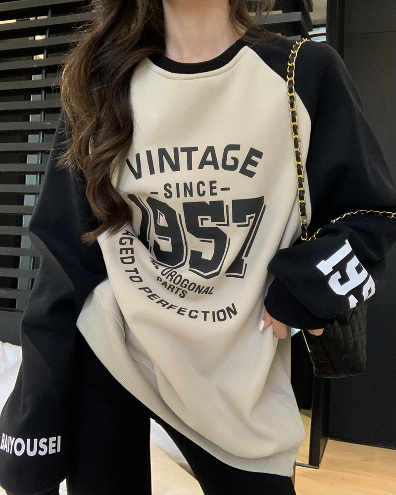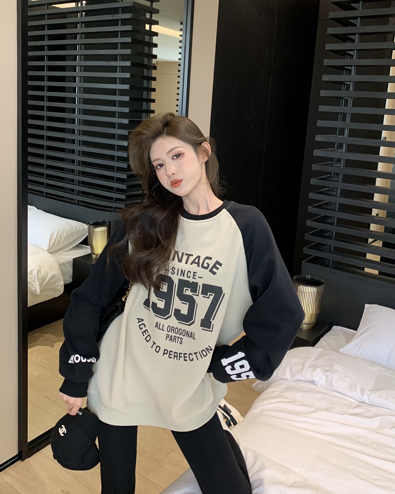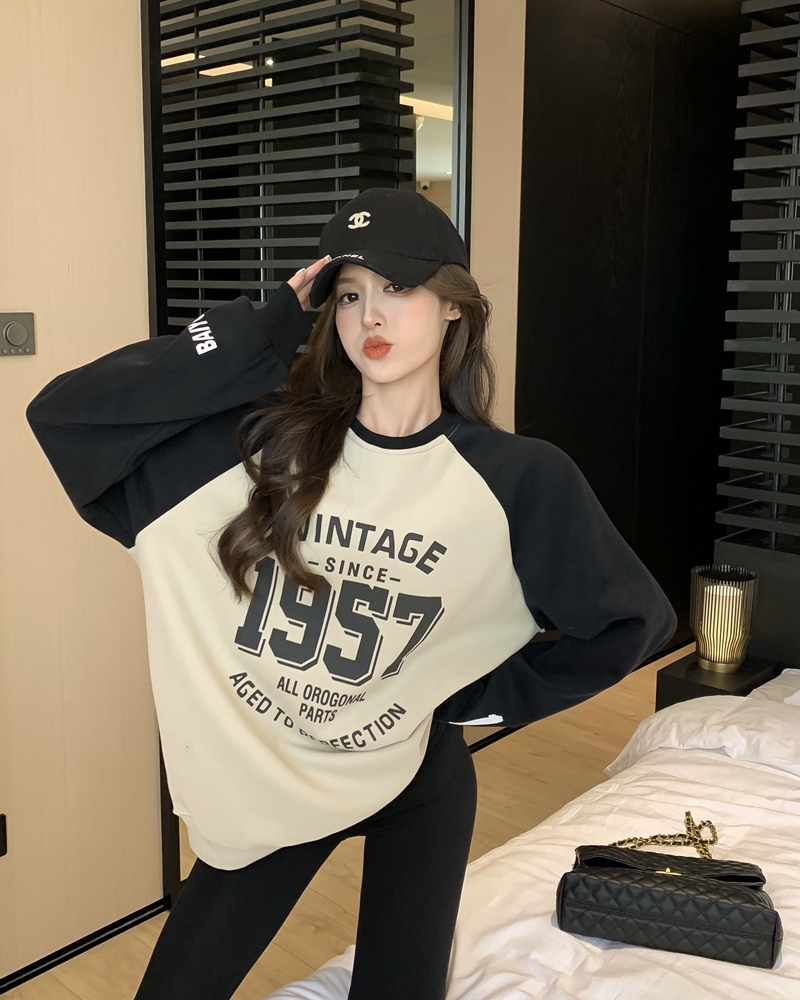 가을과 겨울의 실제 샷 아메리칸 레트로 문자 인쇄 대조 컬러 라글란 슬리브 느슨한 중간 길이의 따뜻한 풀 오버 스웨트 셔츠