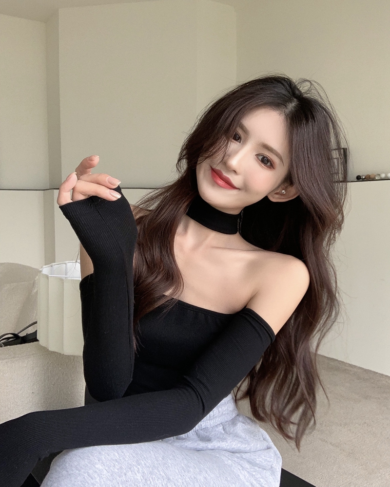 가을 홍콩 스타일의 실제 사진 섹시한 슬림 핏과 슬림 목 노출 쇄골과 바닥 바닥 셔츠 ins 상단