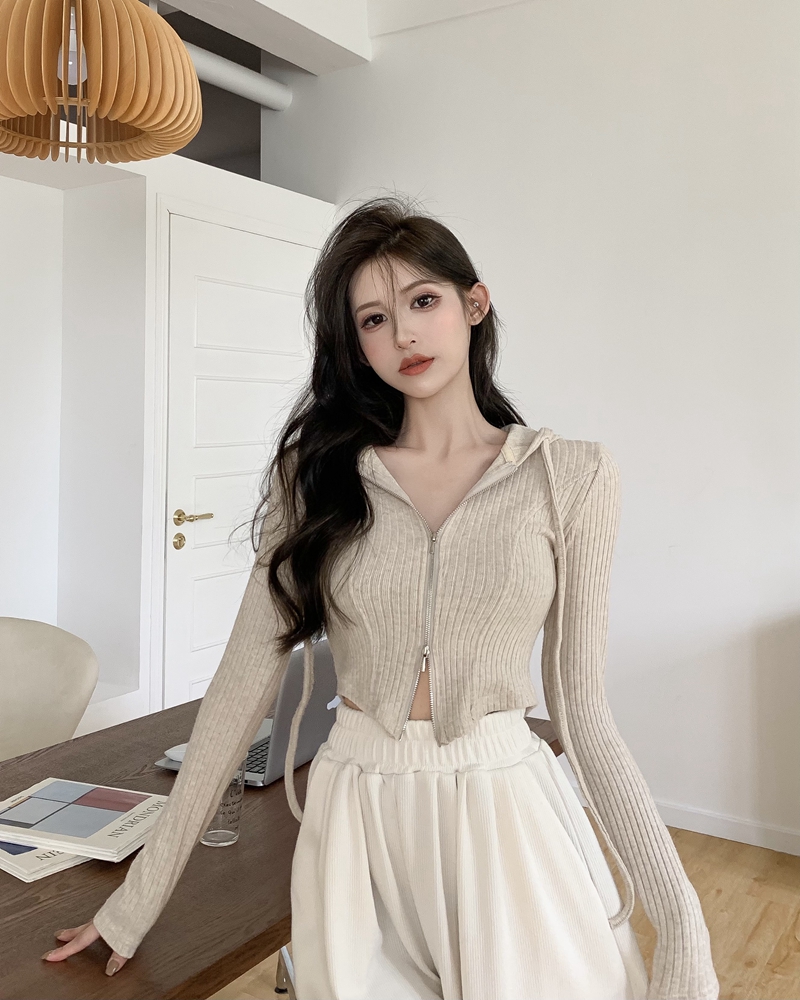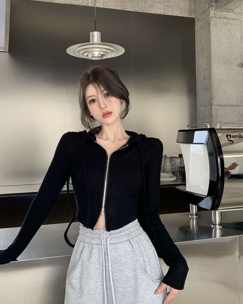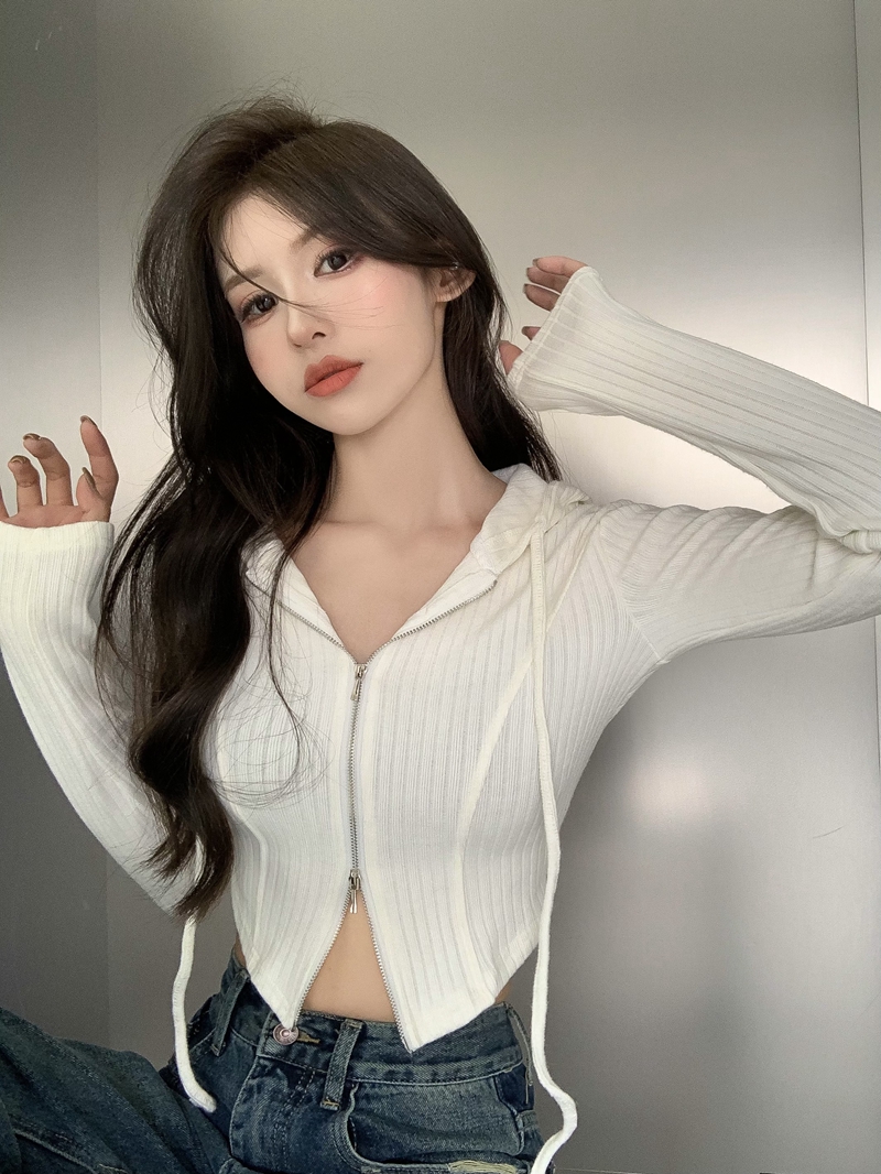 가을 홍콩 스타일의 레트로 슬림 핏 짧은 배꼽 까마귀 in 고 허리 카디건 두꺼운 재킷의 실제 사진
