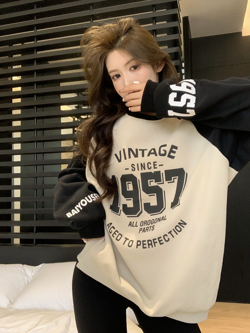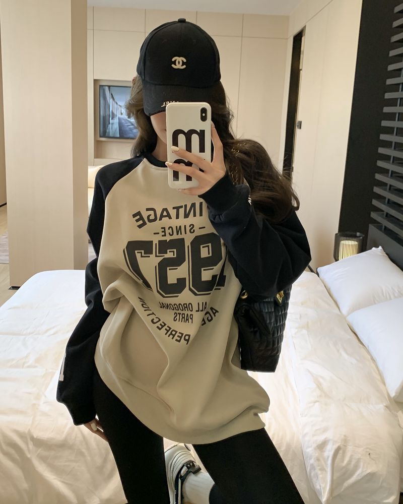 가을과 겨울의 실제 샷 아메리칸 레트로 문자 인쇄 대조 컬러 라글란 슬리브 느슨한 중간 길이의 따뜻한 풀 오버 스웨트 셔츠