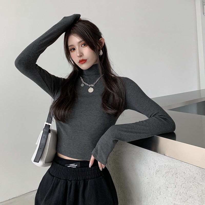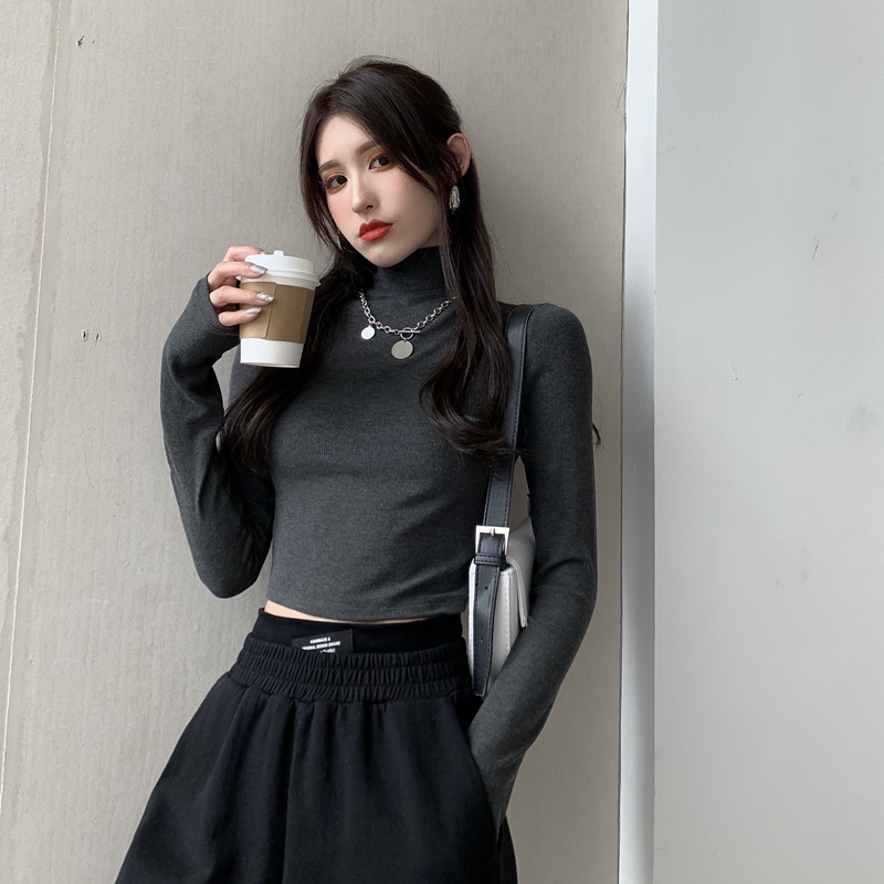 가을과 겨울 홍콩 스타일의 실제 사진 촬영 다목적 반 높이의 목 단 단색 슬림하고 짧은 따뜻한 플러시 긴 플러시 긴팔 내부베이스 셔츠