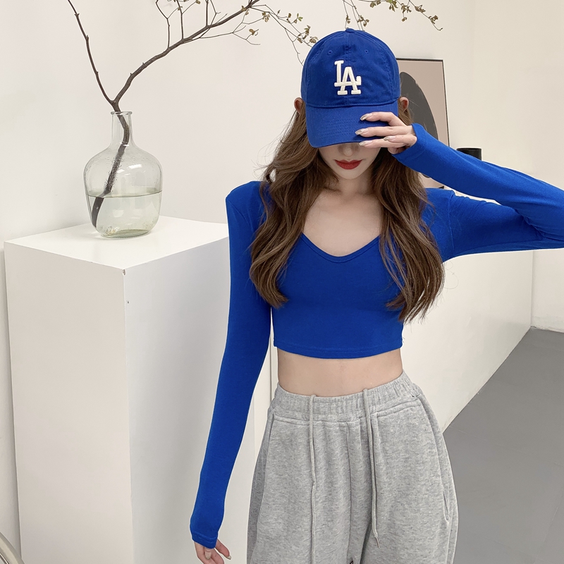 실제 홍콩 스타일 허리가 많은 여성을위한 거대하고 편안한 배꼽에 노출 된 꽉 u-넥 긴팔 티셔츠가 높습니다.