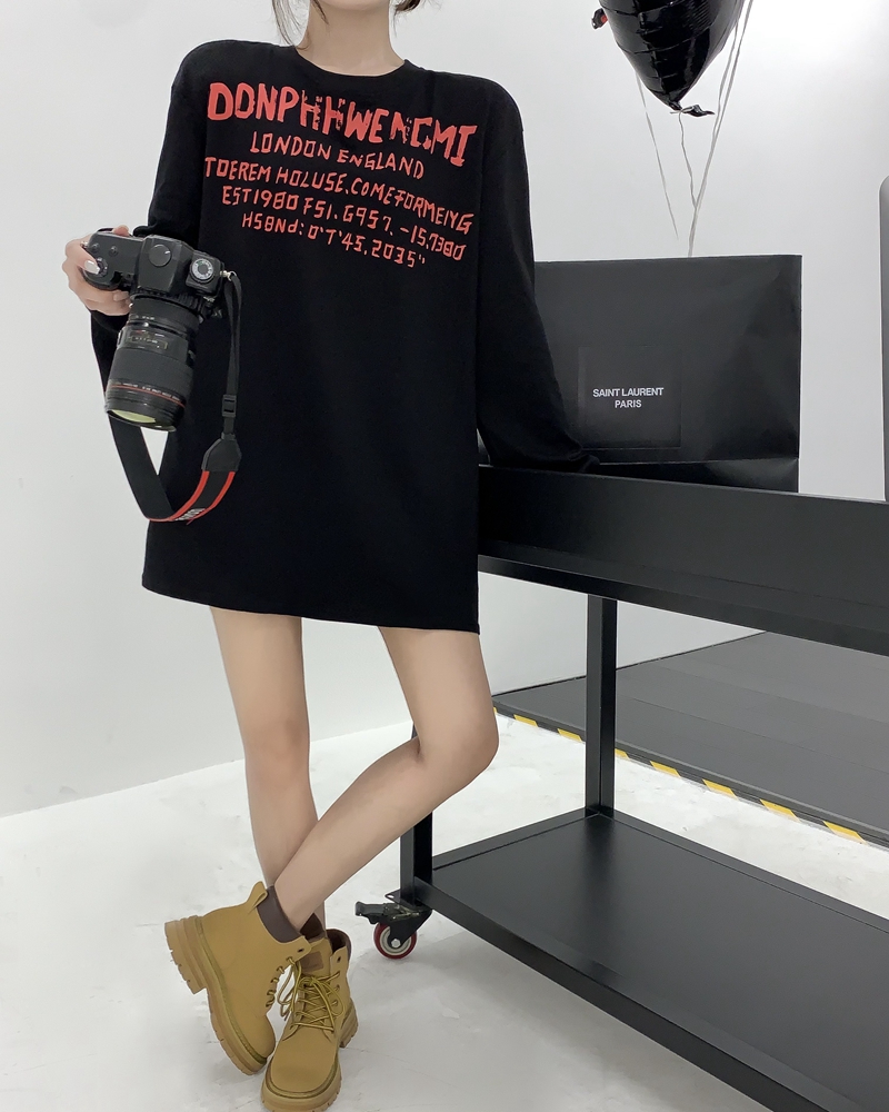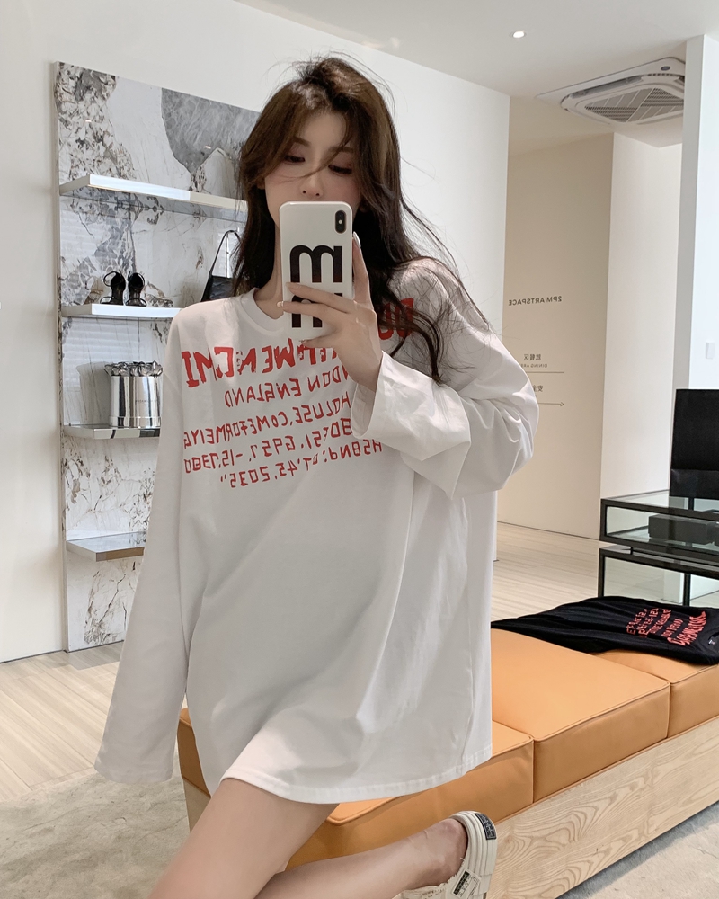 새로운 홍콩 스타일의 디자인과 레터 인쇄 느슨하고 다재다능한 긴 소매 티셔츠 넓이 넓은 버전 최고의 트렌디