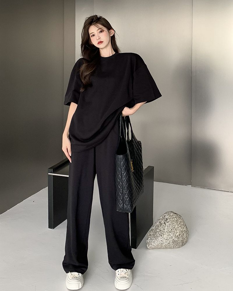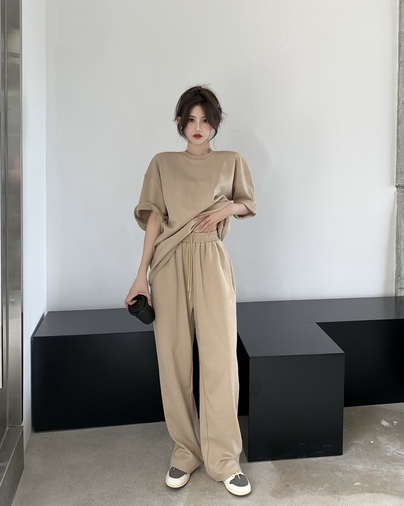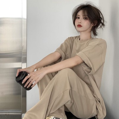 새로운 여름 홍콩 스타일의 실제 샷 유행 및 세련된 얇은 2 피스 세트를 운영하는 여성을위한 게으른 캐주얼 스포츠 슈트