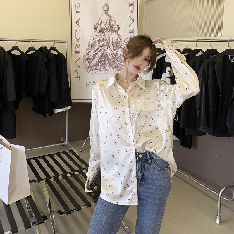 이른 가을 홍콩 스타일 인터넷 유명 인사 웃는 얼굴 인쇄 느슨한 어깨 패드 중간 길이 셔츠 인 얇은 선 스크린 셔츠