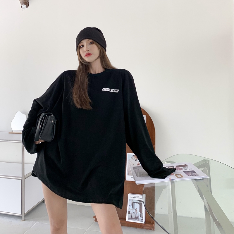 이른 가을 홍콩 스타일의 레트로 프린트 게으른 느슨한 느슨한 오버 사이즈 하단 누락 된 긴팔 티셔츠 ins 탑 트렌디