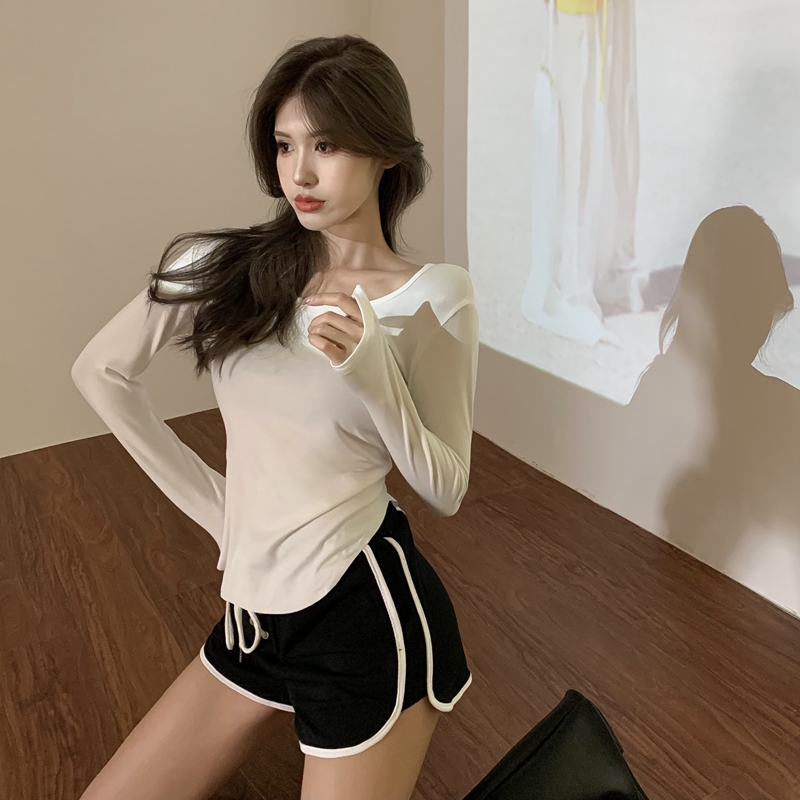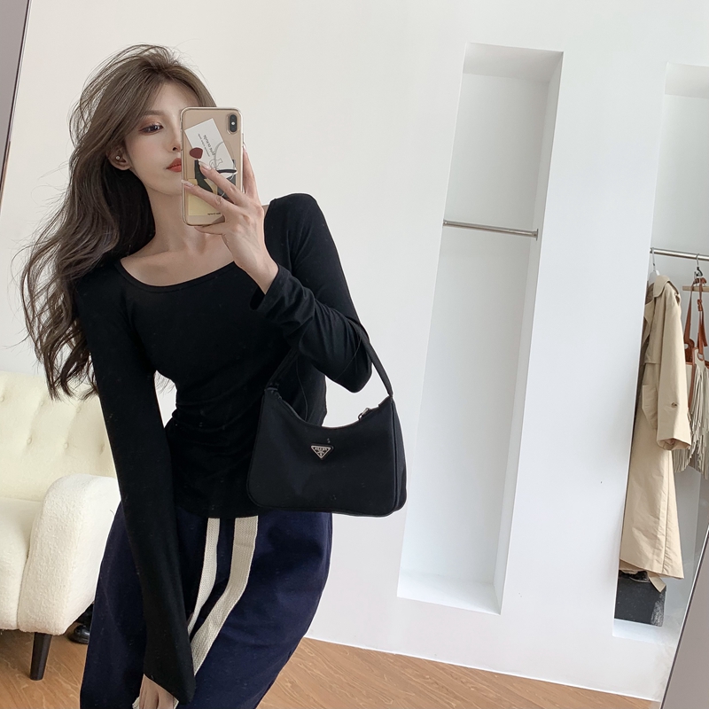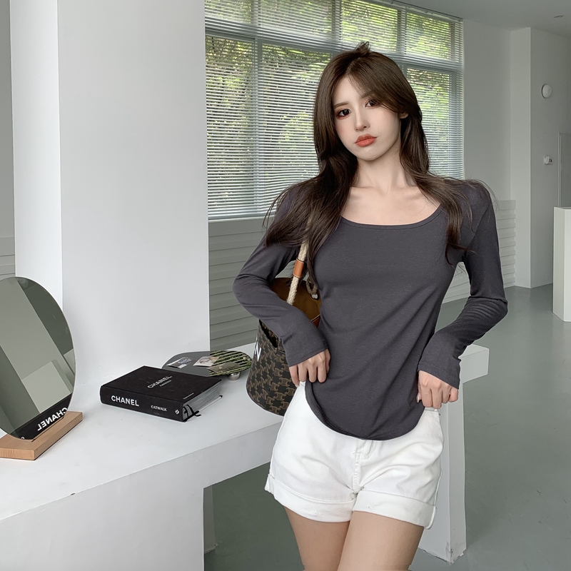 가을과 겨울 홍콩 스타일의 순수 욕망 스타일 슬림하고 슬림 한 구부러진 슬릿 스퀘어 칼라 긴 소매 내부 바닥 셔츠 ins 상단의 실제 사진