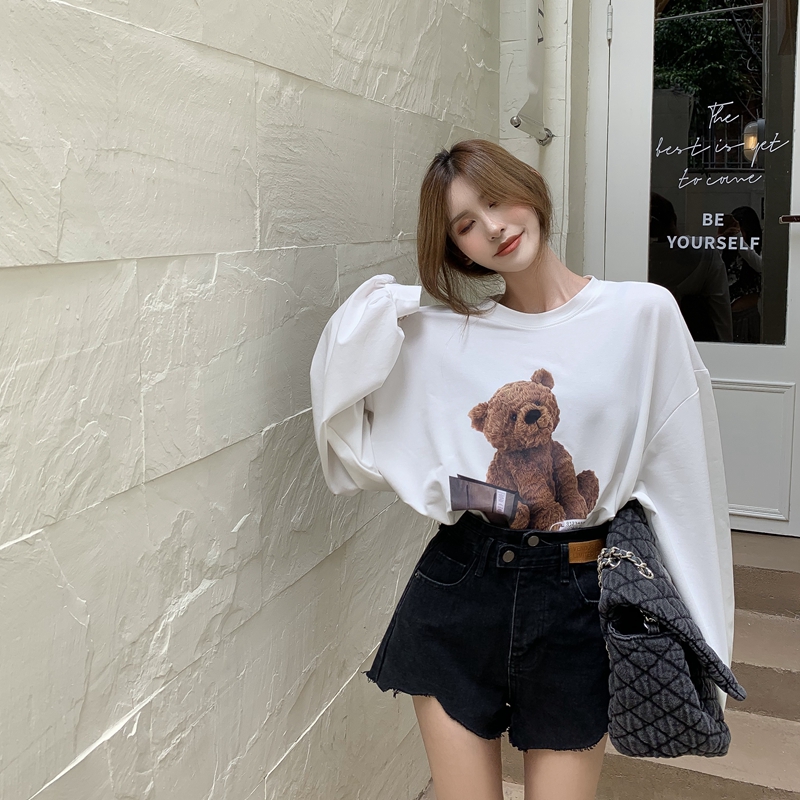 가을과 겨울 홍콩 스타일의 실제 사진 리틀 베어 느슨한 중간 길이의 티셔츠 속옷 누락 된 긴 소매 스웨트 셔츠 in Top Trendy