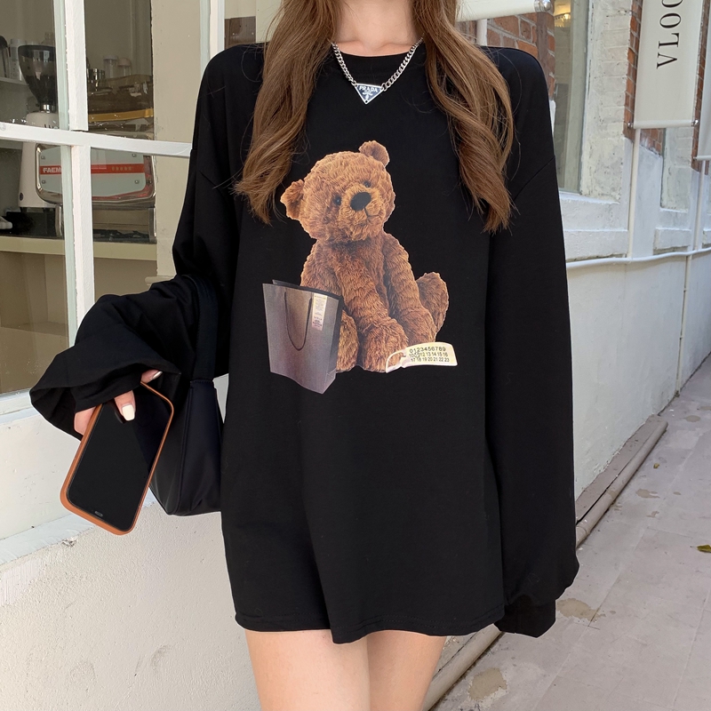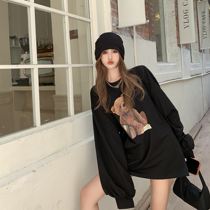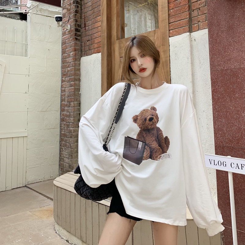 가을과 겨울 홍콩 스타일의 실제 사진 리틀 베어 느슨한 중간 길이의 티셔츠 속옷 누락 된 긴 소매 스웨트 셔츠 in Top Trendy