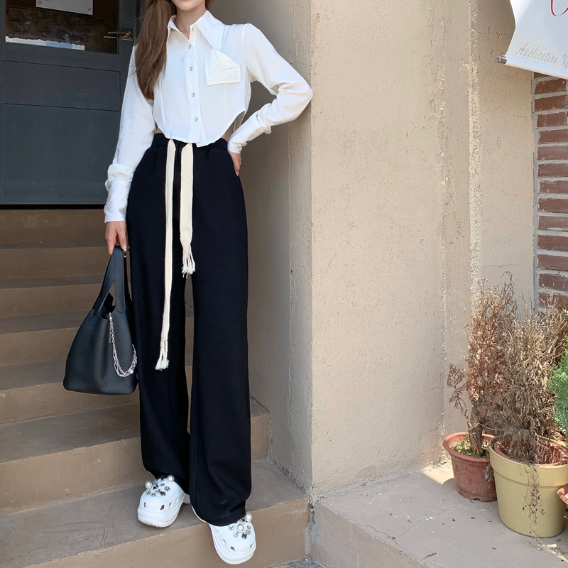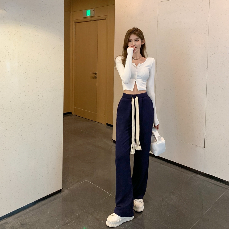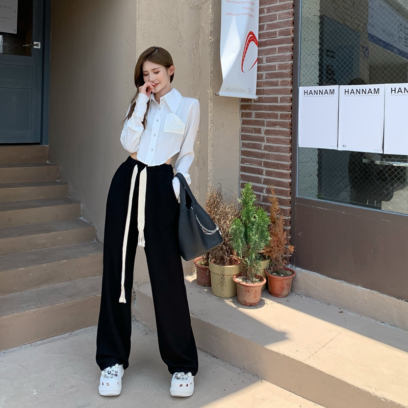 여름 홍콩 스타일의 실제 사진 여성을위한 얇은 허리 슬림 한 캐주얼 넓은 다리 바지 게으른 느슨한 드로 스트링 스포츠 스웨트 셔츠 트렌디