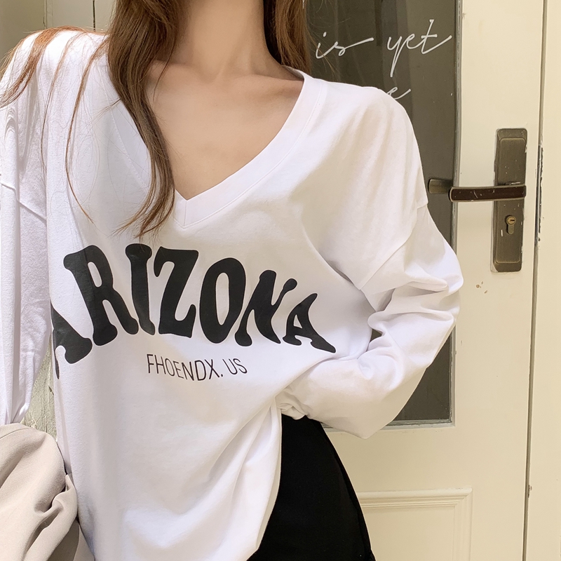실제 사진 가을과 겨울 홍콩 스타일의 편지 인쇄 V- 넥 순수면 편안한 느슨