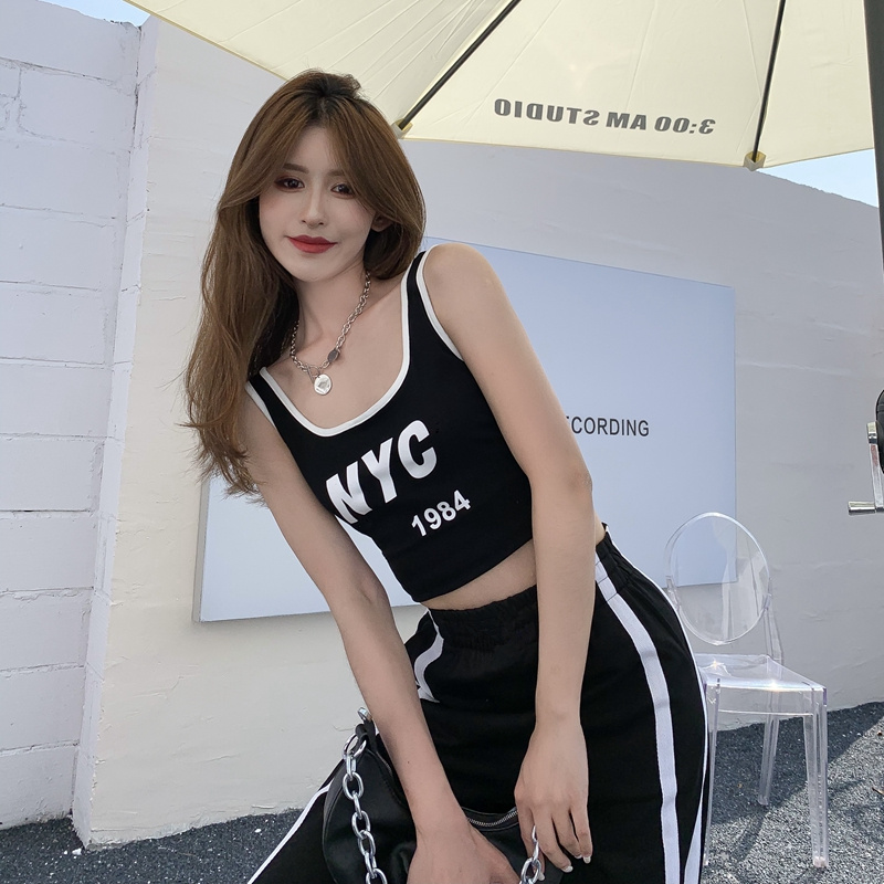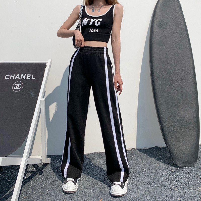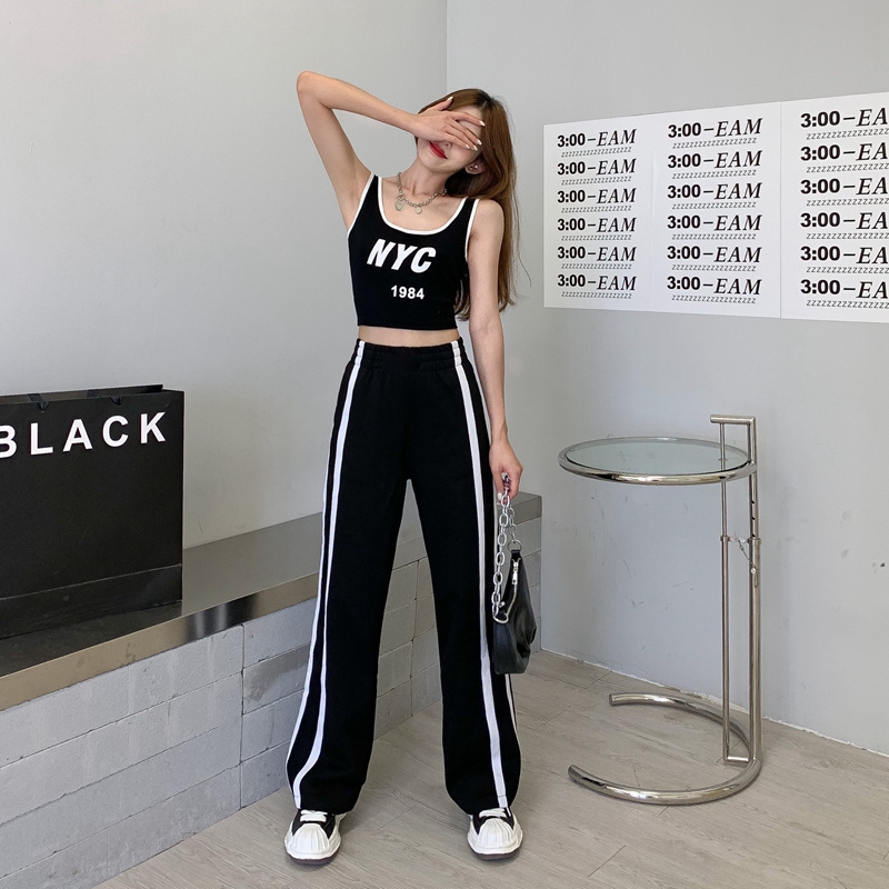 실제 홍콩 스타일의 핫 걸 스타일 편지 인쇄 짧은 배꼽 조끼 + 사이드 스트라이프 하이 허리 캐주얼 넓은 다리 바지 세트