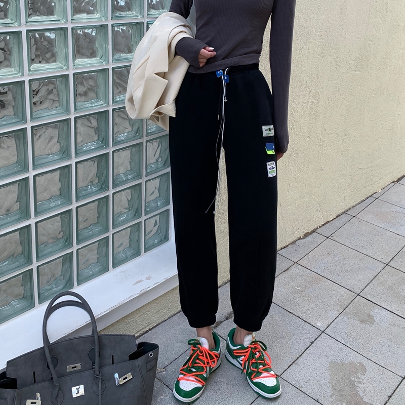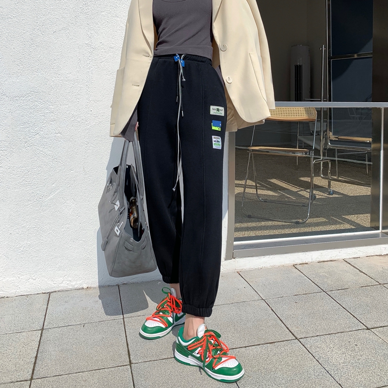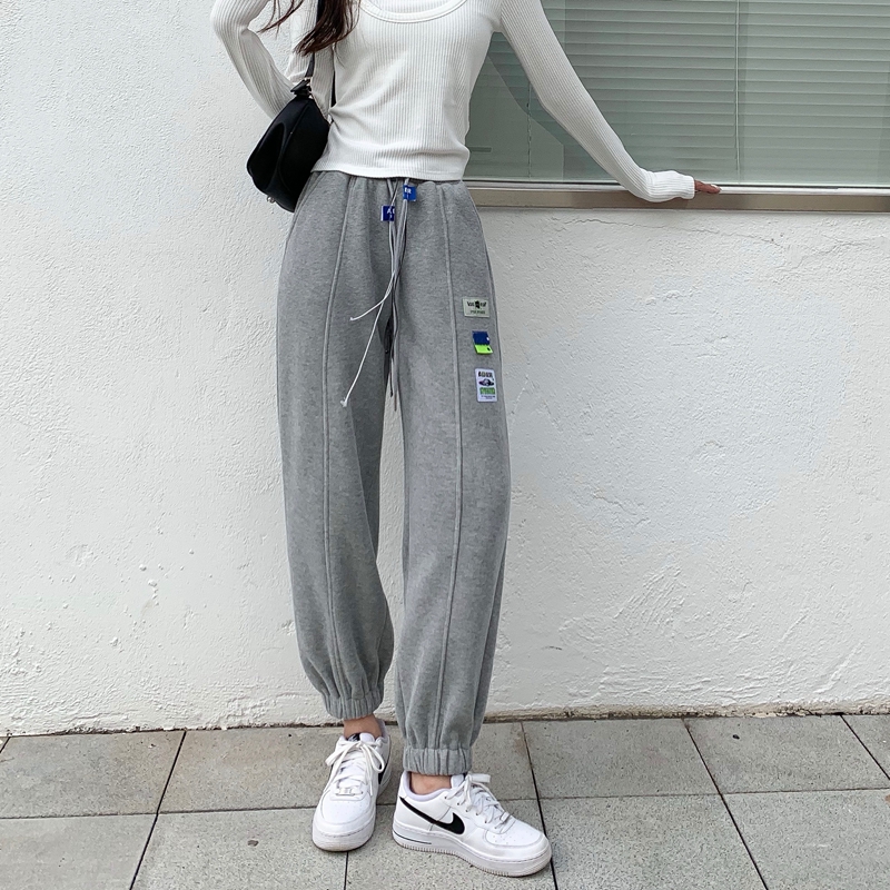 겨울 홍콩 스타일의 진짜 사진 허리 슬림 한 회색 캐주얼 스웨트 셔츠 플러스 벨벳 두꺼운 따뜻한 느슨한 묶인 발 스포츠 바지